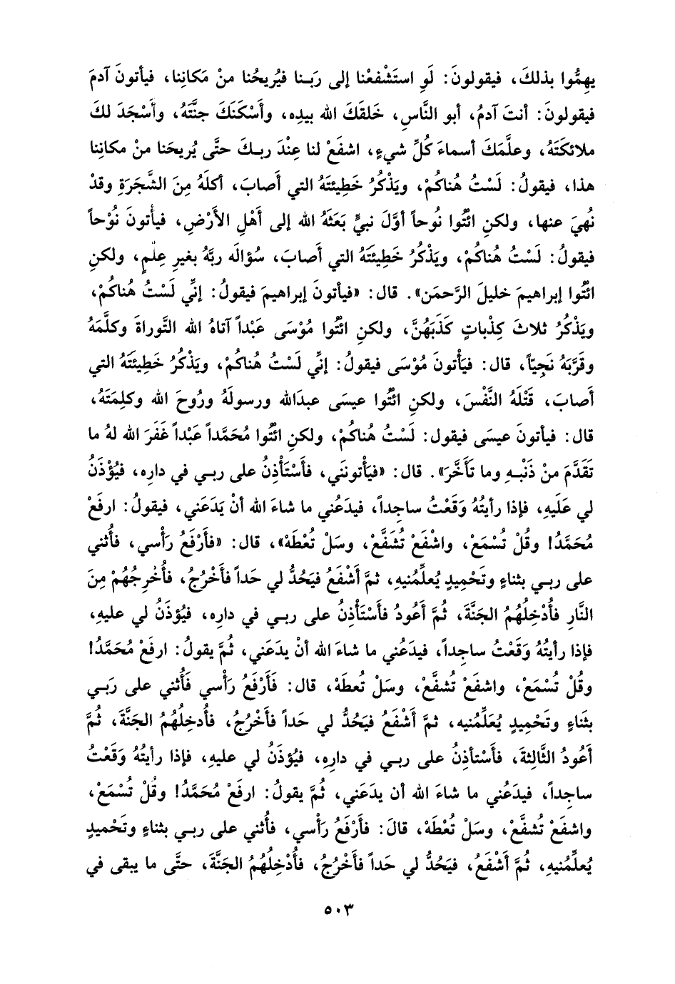 يهِمُّوا بذلكَ، فيقولونَ: لَوِ استَشْفعْنا إلى رَبنا فيُريحُنا منْ مَكانِنا، فيأتونَ آدمَ فيقولونَ: أنتَ آدمُ، أبو النَّاسِ، خَلقَكَ الله بيدِه، وأَسْكَنَكَ جنَّتَهُ، وأَسْجَدَ لكَ ملائكَتَهُ، وعلَّمَكَ أسماءَ كُلِّ شيءٍ، اشفَعْ لنا عِنْدَ ربكَ حتَّى يُريحَنا منْ مكانِنا هذا، فيقولُ: لَسْتُ هُناكُمْ، ويَذْكُرُ خَطِيئتَهُ التي أَصابَ، أكلَهُ مِنَ الشَّجَرَةِ وقدْ نُهيَ عنها، ولكنِ ائْتُوا نُوحًا أوَّلَ نبيٍّ بَعَثَهُ الله إلى أَهْلِ الأَرْضِ، فيأْتونَ نُوْحًا فيقولُ: لَسْتُ هُناكُمْ، ويَذْكُرُ خَطِيئَتَهُ التي أَصابَ، سُؤالَه ربَّهُ بغيرِ عِلْمٍ، ولكنِ ائْتُوا إبراهيمَ خليلَ الرَّحمَن". قال: "فيأتونَ إبراهيمَ فيقولُ: إنَّي لَسْتُ هُناكُمْ، ويَذْكُرُ ثلاثَ كِذْباتٍ كَذَبَهُنَّ، ولكنِ ائْتُوا مُوْسَى عَبْدًا آتاهُ الله التَّوراةَ وكلَّمَهُ وقَرَّبَهُ نَجِيًّا، قال: فيَأْتونَ مُوْسَى فيقولُ: إنَّي لَسْتُ هُناكُمْ، ويَذْكُرُ خَطِيئتَهُ التي أَصابَ، قَتْلَهُ النَّفْسَ، ولكنِ ائْتُوا عيسَى عبدَ الله ورسولَهُ ورُوحَ الله وكلِمَتَهُ، قال: فيأتونَ عيسَى فيقول: لَسْتُ هُناكُمْ، ولكنِ ائْتُوا مُحَمَّدًا عَبْدًا غَفَرَ الله لهُ ما تَقَدَّمَ منْ ذَنْبهِ وما تَأَخَّرَ". قال: "فيَأْتونَني، فأَسْتَأْذِنُ على ربي في دارِه، فيُؤْذَنُ لي عَلَيهِ، فإذا رأيتُهُ وَقَعْتُ ساجِدًا، فيدَعُني ما شاءَ الله أنْ يَدَعَني، فيقولُ: ارفَعْ مُحَمَّدُ! وقُلْ تُسْمَعْ، واشْفَعْ تُشَفَّعْ، وسَلْ تُعْطَهْ"، قال: "فأَرْفَعُ رَأْسي، فأُثني على ربي بثناءٍ وتَحْمِيدٍ يُعلِّمُنيهِ، ثمَّ أَشْفَعُ فيَحُدُّ لي حَدًا فأَخْرُجُ، فأُخْرِجُهُمْ مِنَ النَّارِ فأُدْخِلُهُمُ الجَنَّةَ، ثُمَّ أَعُودُ فأَسْتَأْذِنُ على ربي في دارِه، فيُؤذَنُ لي عليهِ، فإذا رأيتُهُ وَقَعْتُ ساجِدًا، فيدَعُني ما شاءَ الله أنْ يدَعَنيِ، ثُمَّ يقولُ: ارفَعْ مُحَمَّدُ! وقُلْ تُسْمَعْ، واشفَعْ تُشفَّعْ، وسَلْ تُعطَهْ، قال: فَأرْفَعُ رَأْسي فَأُثني على رَبي بثَناءٍ وتَحْمِيدٍ يُعَلِّمُنيه، ثمَّ أَشْفَعُ فيَحُدُّ لي حَدًا فأَخْرُجُ، فأُدخِلُهُمُ الجَنَّةَ، ثُمَّ أَعُودُ الثَّالِثةَ، فأَسْتأذِنُ على ربي في دارِهِ، فيُؤذَنُ لي عليهِ، فإذا رأيتُهُ وَقَعْتُ ساجِدًا، فيدَعُني ما شاءَ الله أن يدَعَني، ثُمَّ يقولُ: ارفَعْ مُحَمَّدُ! وقُلْ تُسْمَعْ، واشفَعْ تُشفَّعْ، وسَلْ تُعْطَهْ، قالَ: فأَرْفَعُ رَأْسي، فأُثني على ربي بثناءٍ وتَحْميدٍ يُعلَّمُنيهِ، ثُمَّ أَشْفَعُ، فيَحُدُّ لي حَدًا فأَخْرُجُ، فأُدْخِلُهُمُ الجَنَّةَ، حتَّى ما يبقى في