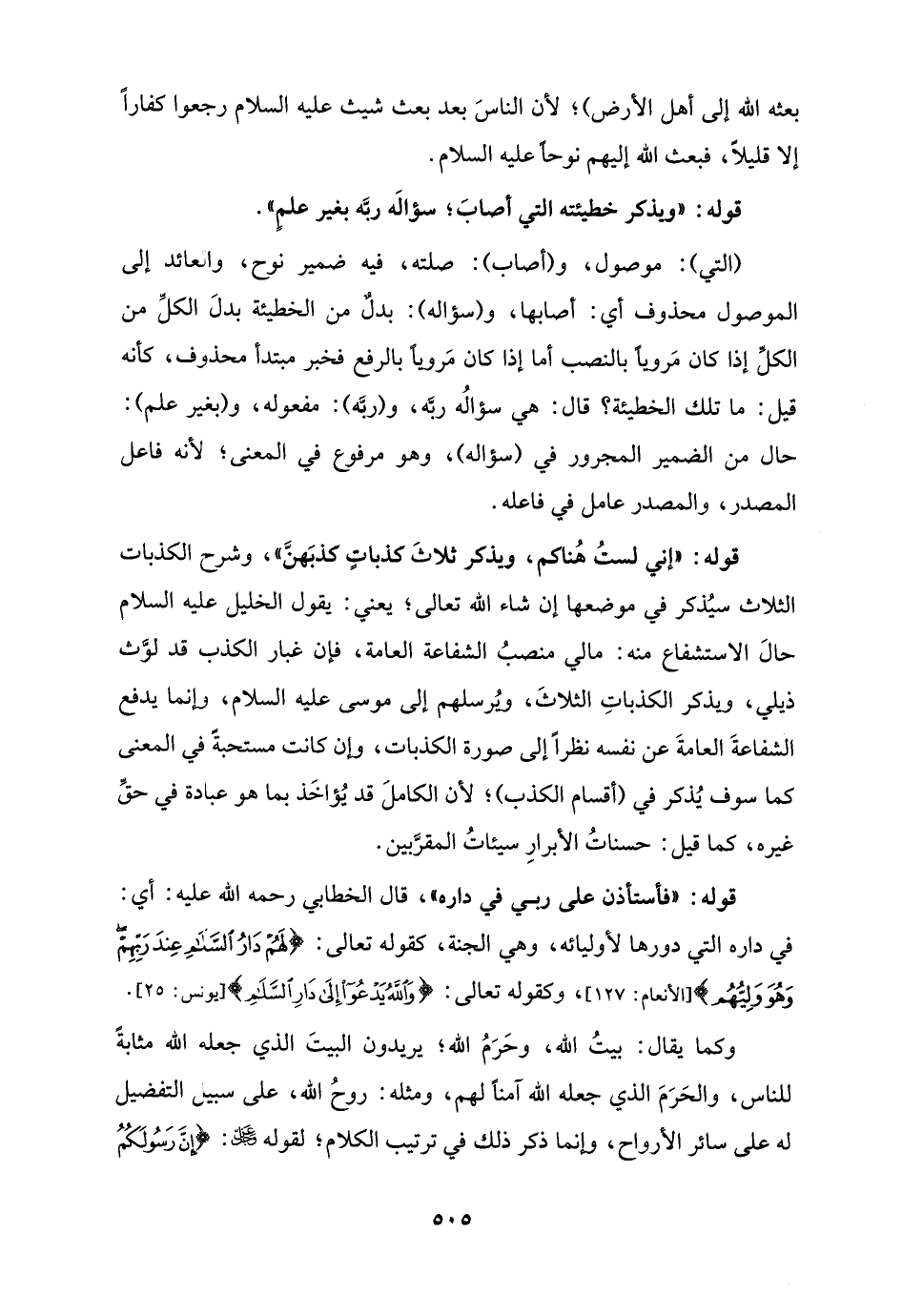 قوله: "ويذكر خطيئته التي أصابَ؛ سؤالَه ربَّه بغير علمٍ".