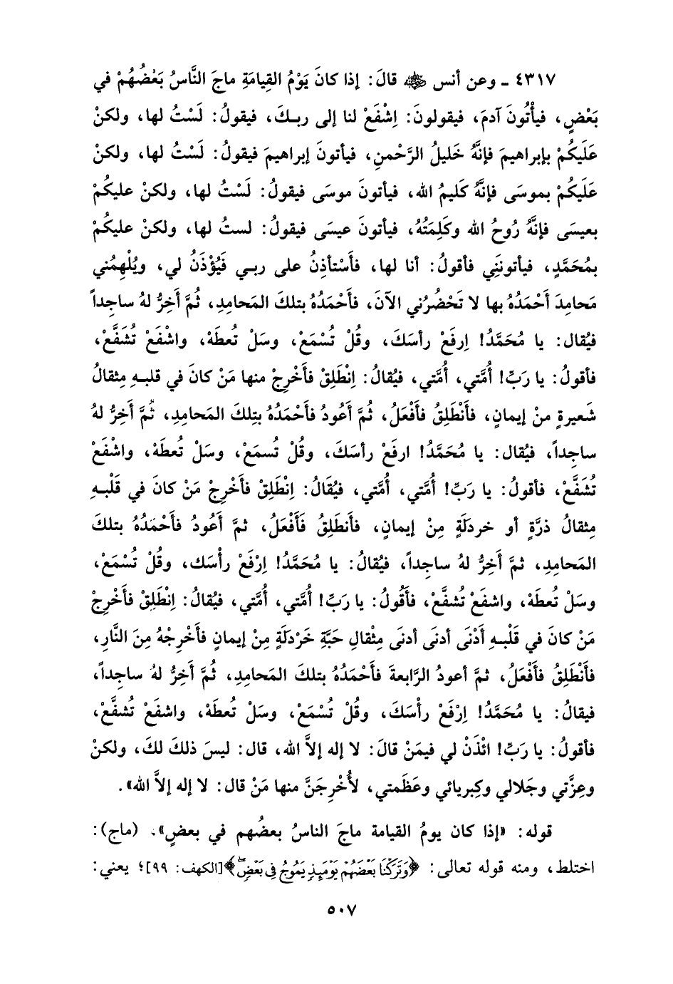 4317 - وعن أنس - رضي الله عنه - قالَ: إذا كانَ يَوْمُ القِيامَةِ ماجَ النَّاسُ بَعضُهُمْ في بَعْضٍ، فيأتُونَ آدمَ، فيقولونَ: اِشْفَعْ لنا إلى ربكَ، فيقولُ: لَسْتُ لها، ولكنْ عَلَيكُمْ بإبراهيمَ فإنَّهُ خَليلُ الرَّحْمنِ، فيأتونَ إبراهيمَ فيقولُ: لَسْتُ لها، ولكنْ عَلَيكُمْ بموسَى فإنَّهُ كَليمُ الله، فيأتونَ موسَى فيقولُ: لَسْتُ لها، ولكنْ عليكُمْ بعيسَى فإنَّهُ رُوحُ الله وكَلِمَتُهُ، فيأتونَ عيسَى فيقولُ: لستُ لها، ولكنْ عليكُمْ بمُحَمَّدٍ، فيأتونَنِي فأقولُ: أنا لها، فأَسْتأذِنُ على ربي فَيُؤْذَنُ لي، ويُلْهِمُني مَحامِدَ أَحْمَدُهُ بها لا تَحْضُرُني الآنَ، فأَحْمَدُهُ بتلكَ المَحامِدِ، ثُمَّ أَخِرُّ لهُ ساجِدًا فيُقال: يا مُحَمَّدُ! اِرفَعْ رأسَكَ، وقُلْ تُسْمَعْ، وسَلْ تُعطَهْ، واشْفَعْ تُشَفَّعْ، فأقولُ: يا رَبِّ! أُمَّتي، أُمَّتي، فيُقالُ: اِنْطَلِقْ فأَخْرِجْ منها مَنْ كانَ في قلبهِ مِثقالُ شَعيرةٍ منْ إيمانٍ، فأَنْطَلِقُ فأَفْعَلُ، ثُمَّ أَعُودُ فأَحْمَدُهُ بتِلكَ المَحامِدِ، ثمَّ أَخِرُّ لهُ ساجِدًا، فيُقال: يا مُحَمَّدُ! ارفَعْ رأسَكَ، وقُلْ تُسمَعْ، وسَلْ تُعطَهْ، واشْفَعْ تُشَفَّعْ، فأقولُ: يا رَبِّ! أُمَّتي، أُمَّتي، فيُقَالُ: اِنْطَلِقْ فأخْرِجْ مَنْ كانَ في قَلْبهِ مِثقالُ ذرَّةٍ أو خردَلَةٍ مِنْ إيمانٍ، فأنطَلِقُ فَأَفْعَلُ، ثمَّ أَعُودُ فأَحْمَدُهُ بتلكَ المَحامِدِ، ثمَّ أَخِرُّ لهُ ساجِدًا، فيُقالُ: يا مُحَمَّدُ! اِرْفَعْ رأْسَك، وقُلْ تُسْمَعْ، وسَلْ تُعطَهْ، واشفَعْ تُشفَّعْ، فأَقُولُ: يا رَبِّ! أُمَّتي، أُمَّتي، فيُقالُ: اِنْطَلِقْ فأَخْرِجْ مَنْ كانَ في قَلْبهِ أَدْنَى أدنَى أدنَى مِثْقالِ حَبَّةِ خَرْدَلَةٍ مِنْ إيمانٍ فأَخْرِجْهُ مِنَ النَّارِ، فأَنْطَلِقُ فأفْعَلُ، ثمَّ أعودُ الرَّابعةَ فأحْمَدُهُ بتلكَ المَحامِدِ، ثُمَ أَخِرُّ له ساجِدًا، فيقالُ: يا مُحَمَّدُ! اِرْفَعْ رأْسَكَ، وقُلْ تُسْمَعْ، وسَلْ تُعطَهْ، واشفَعْ تُشفَّعْ، فأقولُ: يا رَبِّ! ائْذَنْ لي فيمَنْ قالَ: لا إله إلَّا الله، قال: ليسَ ذلكَ لكَ، ولكنْ وعِزَّتي وجَلالي وكِبريائي وعَظَمتي، لأُخْرِجَنَّ منها مَنْ قال: لا إله إلَّا الله".