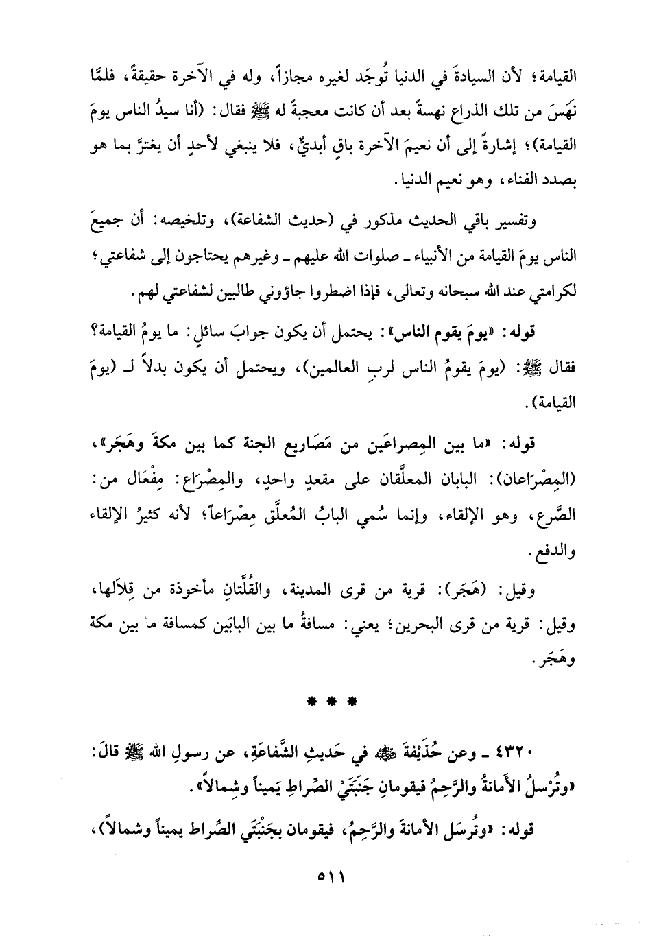 4320 - وعن حُذَيْفةَ - رضي الله عنه - في حَديثِ الشَّفاعَةِ، عن رسولِ الله - صلى الله عليه وسلم - قالَ: "وتُرْسلُ الأَمانةُ والرَّحِمُ فيقومانِ جَنَبَتَيْ الصِّراطِ يَمينًا وشِمالًا".