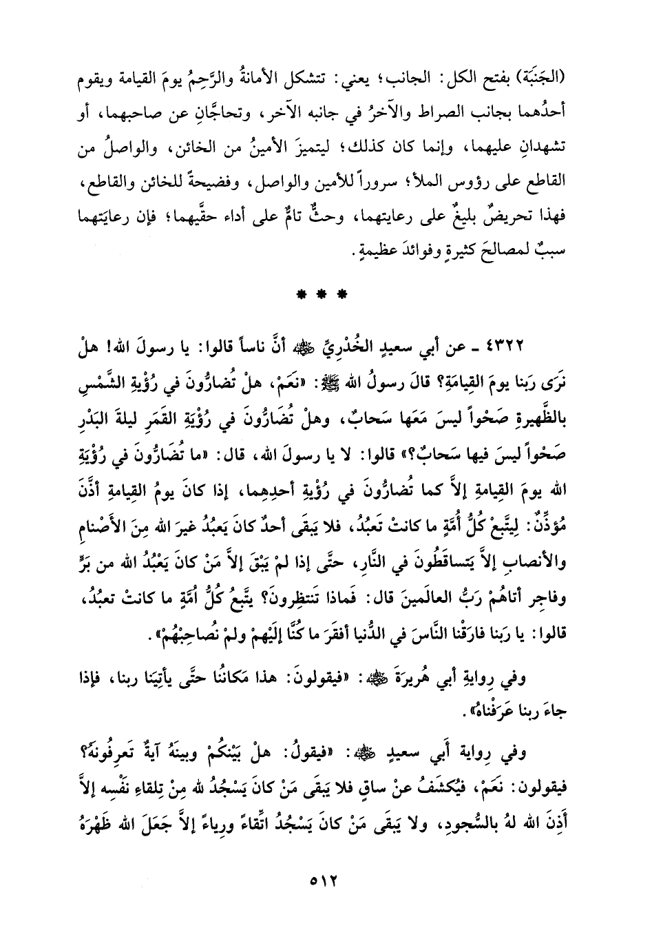 4322 - عن أبي سعيدٍ الخُدْرِيِّ - رضي الله عنه - أنَّ ناسًا قالوا: يا رسولَ الله! هلْ نَرَى رَبنا يومَ القِيامَةِ؟ قالَ رسولُ الله - صلى الله عليه وسلم -: "نَعَمْ، هلْ تُضارُّونَ في رُؤْيةِ الشَّمْسِ بالظَّهيرةِ صَحْوًا ليسَ مَعَها سَحابٌ، وهلْ تُضَارُّونَ في رُؤْيَةِ القَمَرِ ليلةَ البَدْرِ صَحْوًا ليسَ فيها سَحابٌ؟ " قالوا: لا يا رسولَ الله، قال: "ما تُضَارُّونَ في رُؤْيَةِ الله يومَ القِيامةِ إلَّا كما تُضارُّونَ في رُؤْيةِ أحدِهِما، إذا كانَ يومُ القِيامةِ أذَّنَ مُؤذِّنٌ: لِيتَّبعْ كُلُّ أُمَّةٍ ما كانتْ تَعبُدُ، فلا يَبقَى أحدٌ كانَ يَعبُدُ غيرَ الله مِنَ الأَصْنامِ والأنصابِ إلَّا يَتساقَطُونَ في النَّارِ، حتَّى إذا لمْ يَبْقَ إلَّا مَنْ كانَ يَعْبُدُ الله من بَرٍّ وفاجِر أتاهُمْ رَبُّ العالَمينَ قال: فَماذا تَنتظِرونَ؟ يتَّبعُ كُلُّ أُمَّةٍ ما كانتْ تعبُدُ، قالوا: يا رَبنا فارَقْنا النَّاسَ في الدُّنيا أفقَرَ ما كُنَّا إلَيْهمْ ولمْ نُصاحِبْهُمْ".