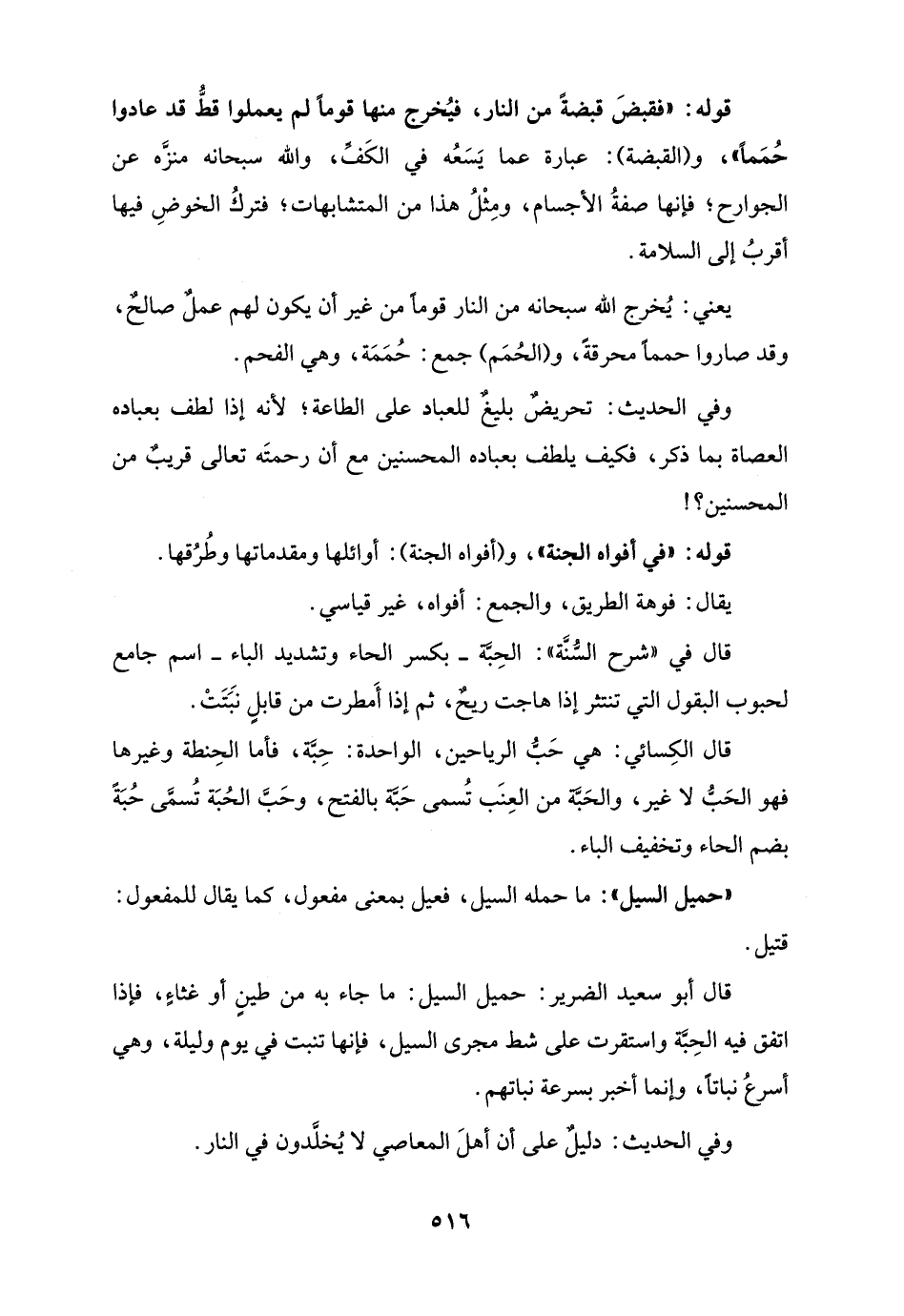 قوله: "فقبضَ قبضةً من النار، فيُخرج منها قومًا لم يعملوا قطُّ قد عادوا حُمَمًا"، و (القبضة): عبارة عما يَسَعُه في الكَفِّ، والله سبحانه منزَّه عن الجوارح؛ فإنها صفةُ الأجسام، ومِثْلُ هذا من المتشابهات؛ فتركُ الخوضِ فيها أقربُ إلى السلامة.