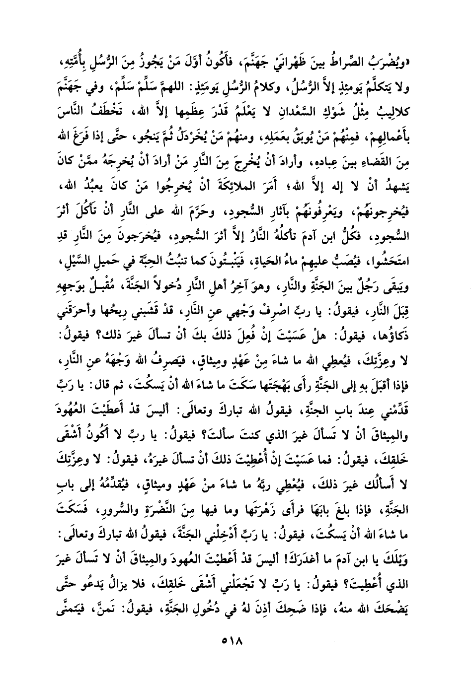 "ويُضْرَبُ الصِّراطُ بينَ ظَهْرانَيْ جَهَنَّمَ، فأَكُونُ أوَّلَ مَنْ يَجُوزُ مِنَ الرُّسُلِ بِأُمَّتِهِ، ولا يتكلَّمُ يَومئِذٍ إلَّا الرُّسُلُ، وكلامُ الرُّسُلِ يَومَئِذٍ: اللهمَّ سَلِّمْ سَلِّمْ، وفي جَهَنَّمَ كلالِيبُ مِثْلُ شَوْكِ السَّعْدانِ لا يَعْلَمُ قَدْرَ عِظَمِها إلَّا الله، تَخْطَفُ النَّاسَ بأَعْمالِهِمْ، فمِنْهُمْ مَنْ يُوبَقُ بعَمَلِهِ، ومنهُمْ مَنْ يُخَرْدَلُ ثُمَّ يَنجُو، حتَّى إذا فَرَغَ الله مِنَ القَضاءِ بينَ عِبادهِ، وأرادَ أنْ يُخْرِجَ مِنَ النَّارِ مَنْ أرادَ أنْ يُخرِجَهُ ممَّنْ كانَ يَشهدُ أنْ لا إله إلَّا الله؛ أَمَرَ الملائِكَةَ أنْ يُخرِجُوا مَنْ كانَ يعبُدُ الله، فيُخرِجونَهُمْ، ويَعْرِفُونَهُمْ بآثارِ السُّجودِ، وحَرَّمَ الله على النَّارِ أنْ تَأكُلَ أثرَ السُّجودِ، فكُلُّ ابن آدمَ تأكلُهُ النَّارُ إلاَّ أثرَ السُّجودِ، فيُخرَجونَ مِنَ النَّارِ قدِ امتَحَشُوا، فيُصَبُّ عليهِمْ ماءُ الحَياةِ، فَيَنْبتُونَ كما تنبُتُ الحِبَّة في حَميلِ السَّيْلِ، ويَبقَى رَجُلٌ بينَ الجَنَّةِ والنَّارِ، وهوَ آخِرُ أهلِ النَّارِ دُخولًا الجَنَّةَ، مُقْبلٌ بوَجهِهِ قِبَلَ النَّارِ، فيقولُ: يا ربِّ اصْرِفْ وَجْهي عنِ النَّارِ، قدْ قَشَبني رِيحُها وأحرَقَني ذَكاؤُها، فيقولُ: هلْ عَسَيْتَ إنْ فُعِلَ ذلكَ بكَ أنْ تسألَ غيرَ ذلك؟ فيقولُ: لا وعِزَّتِكَ، فيُعطِي الله ما شاءَ مِنْ عَهْدٍ ومِيثاقٍ، فيَصرِفُ الله وَجْهَهُ عنِ النَّارِ، فإذا أقبَلَ بهِ إلى الجَنَّةِ رأَى بَهْجَتَها سَكَتَ ما شاءَ الله أنْ يَسكُتَ، ثم قال: يا رَبِّ قَدِّمْني عِندَ بابِ الجنَّةِ، فيقولُ الله تباركَ وتعالَى: أليسَ قدْ أَعطَيْتَ العُهُودَ والمِيثاقَ أنْ لا تَسألَ غيرَ الذي كنتَ سألتَ؟ فيقولُ: يا ربَّ لا أَكُونُ أَشْقَى خَلقِكَ، فيقولُ: فما عَسَيْتَ إنْ أُعْطِيْتَ ذلكَ أنْ تسألَ غيرَهُ، فيقولُ: لا وعِزَّتِكَ لا أَسألُك غيرَ ذلكَ، فيُعْطِي ربَّهُ ما شاءَ منْ عَهْدٍ وميثاقٍ، فيُقدِّمُهُ إلى بابِ الجَنَّةِ، فإذا بلغَ بابَهَا فرأَى زَهْرَتَها وما فيها مِنَ النَّضْرَةِ والسُّرورِ، فَسَكَتَ ما شاءَ الله أنْ يَسكُتَ، فيقولُ: يا رَبَّ أَدْخِلْني الجَنَّةَ، فيقولُ الله تباركَ وتعالَى: وَيْلَكَ يا ابن آدمَ ما أغدَرَكَ! أليسَ قدْ أَعْطيْتَ العُهودَ والمِيثاقَ أنْ لا تَسألَ غيرَ الذي أُعْطِيتَ؟ فيقولُ: يا رَبِّ لا تَجْعَلْني أَشْقَى خَلقِكَ، فلا يزالُ يَدعُو حتَّى يَضْحَكَ الله منهُ، فإذا ضَحِكَ أذِنَ لهُ في دُخُولِ الجَنَّةِ، فيقولُ: تَمنَّ، فيَتمنَّى