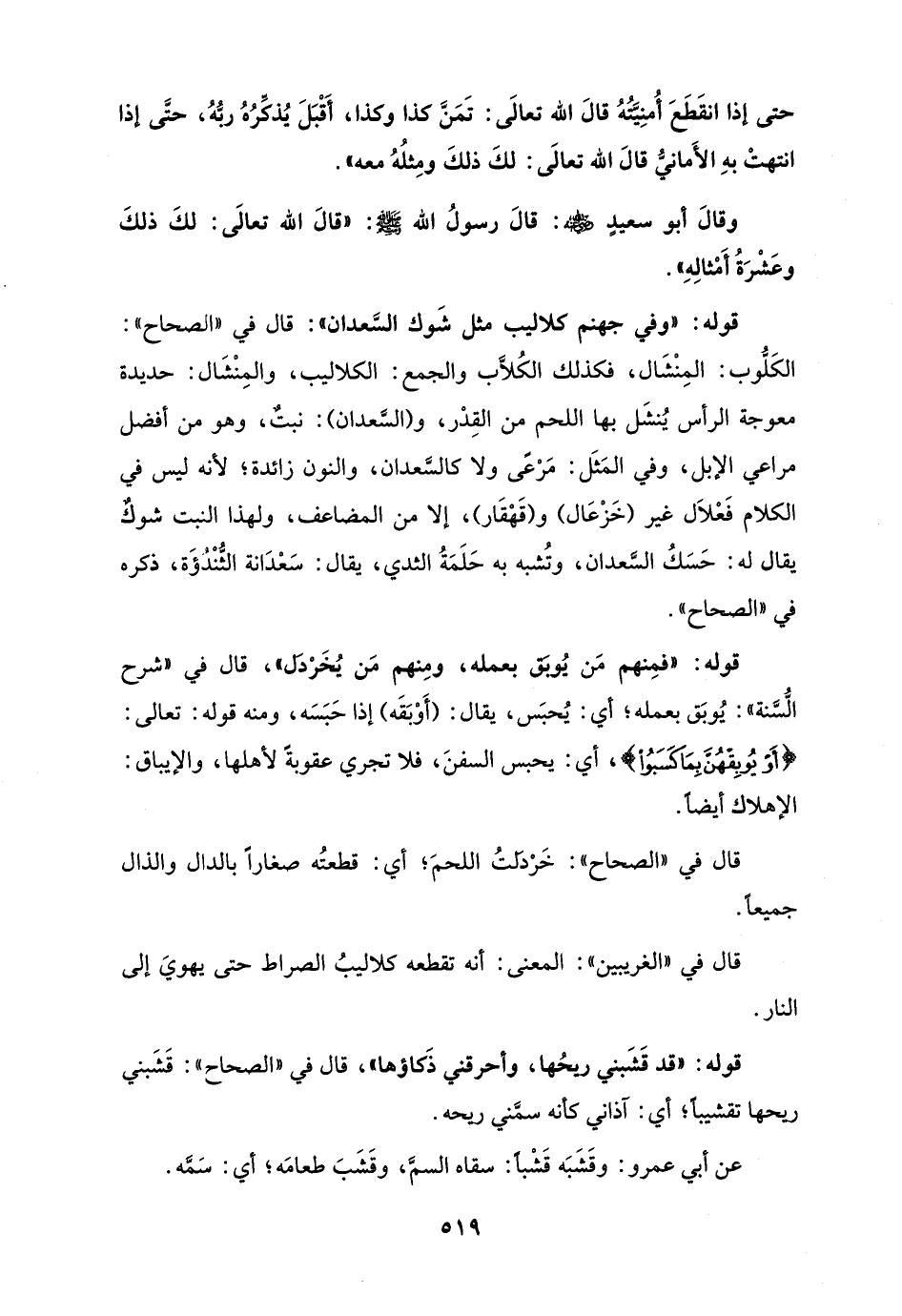 قوله: "وفي جهنم كلاليب مثل شَوك السَّعدان": قال في "الصحاح": الكَلُّوب: المِنْشَال، فكذلك الكُلَّاب والجمع: الكلاليب، والمِنْشَال: حديدة معوجة الرأس يُنشَل بها اللحم من القِدْر، و (السَّعدان): نبتٌ، وهو من أفضل مراعي الإبل، وفي المَثَل: مَرْعًى ولا كالسَّعدان، والنون زائدة؛ لأنه ليس في الكلام فَعْلاَل غير (خَزْعَال) و (قَهْقَار)، إلا من المضاعف، ولهذا النبت شوكٌ يقال له: حَسَكُ السَّعدان، وتُشبه به حَلَمَةُ الثدي، يقال: سَعْدَانة الثُّنْدُؤَة، ذكره في "الصحاح".