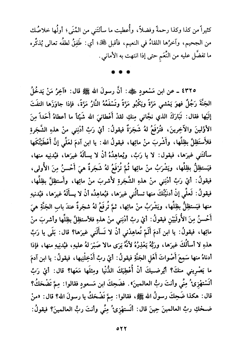4325 - عن ابن مَسْعودٍ - رضي الله عنه -: أنَّ رسولَ الله - صلى الله عليه وسلم - قال: "آخِرُ مَنْ يَدخُلُ الجَنَّةَ رَجُلٌ فهوَ يَمْشي مَرَّةً ويَكْبُو مَرَّةً وتَسْفَعُهُ النَّارُ مَرَّةً، فإذا جاوَزَها التفَتَ إلَيْها فقال: تَبَارَكَ الذي نجَّاني مِنكِ لقدْ أَعْطانيَ الله شَيْئًا ما أعطاهُ أَحَدًا مِنَ الأوَّلينَ والآخِرينَ، فتُرْفَعُ لهُ شَجَرَةٌ فيقولُ: أيْ رَبِّ أدْنِني منْ هذهِ الشَّجَرةِ فلأَستَظِلَّ بظِلِّها، وأَشْربَ منْ مائِها، فيقولُ الله: يا ابن آدمَ لعَلِّي إنَّ أَعْطَيْتُكَها سألتَني غيرَها، فيقول: لا يا رَبِّ، ويُعاهِدُهُ أنْ لا يسألَهُ غيرَها، فيُدنِيه منها، فيَستظِلُّ بظِلِّها، ويَشْرَبُ منْ مائِها ثُمَّ تُرْفَعُ لهُ شَجَرةٌ هيَ أَحْسنُ مِنَ الأُولى، فيقولُ: أيْ رَبِّ أدْنِني منْ هذهِ الشَّجَرةِ لأَشربَ منْ مائِها، وأَستظِلَّ بظِلِّها، فيقولُ: لَعلِّي إنْ أدنَيْتُكَ منها تسألُني غيرَها، فيُعاهِدُه أنْ لا يسأَلَهُ غيرَها، فيُدنيهِ منها فيَستظِلُّ بظِلِّها، ويَشْرَبُ منْ مائِها، ثمَّ تُرفَعُ لهُ شجَرةٌ عندَ بابِ الجَنَّةِ هيَ أَحْسنُ مِنَ الأولَيَيْنِ فيقولُ: أيْ ربِّ أدْنِني منْ هذهِ فلأستظِلَّ بظِلِّها وأشربَ منْ مائِها، فيقولُ: يا ابن آدمَ أَلَمْ تُعاهِدْني أنْ لا تَسأَلَني غيرَها؟ قال: بَلَى يا رَبِّ هذهِ لا أسألُكَ غيرَها، ورَبُّهُ يَعْذِرُهُ لأنَّهُ يَرَى ما لا صَبْرَ لهُ عليهِ، فيُدنِيهِ منها، فإذا أدناهُ منها سَمِعَ أَصْواتَ أَهْلِ الجَنَّةِ فيقولُ: أيْ ربِّ أَدْخِلْنِيها، فيقولُ: يا ابن آدمَ ما يَصْرِيني منكَ؟ أيُرضيكَ أنْ أُعْطِيَكَ الدُّنْيا ومِثلَها مَعَها؟ قال: أيْ رَبِّ أتَسْتهْزِئُ مِنِّي وأنتَ ربُّ العالمينَ". فضَحِكَ ابن مَسعودٍ فقالوا: مِمَّ تَضْحَكُ؟ قال: هكذا ضَحِكَ رسولُ الله - صلى الله عليه وسلم -، فقالوا: مِمَّ تَضْحَكُ يا رسولَ الله؟ قال: "منْ ضحْكِ ربِّ العالمينَ حِينَ قال: أتَستهْزِئُ مِنِّي وأنتَ ربُّ العالمينَ؟ فيقولُ: