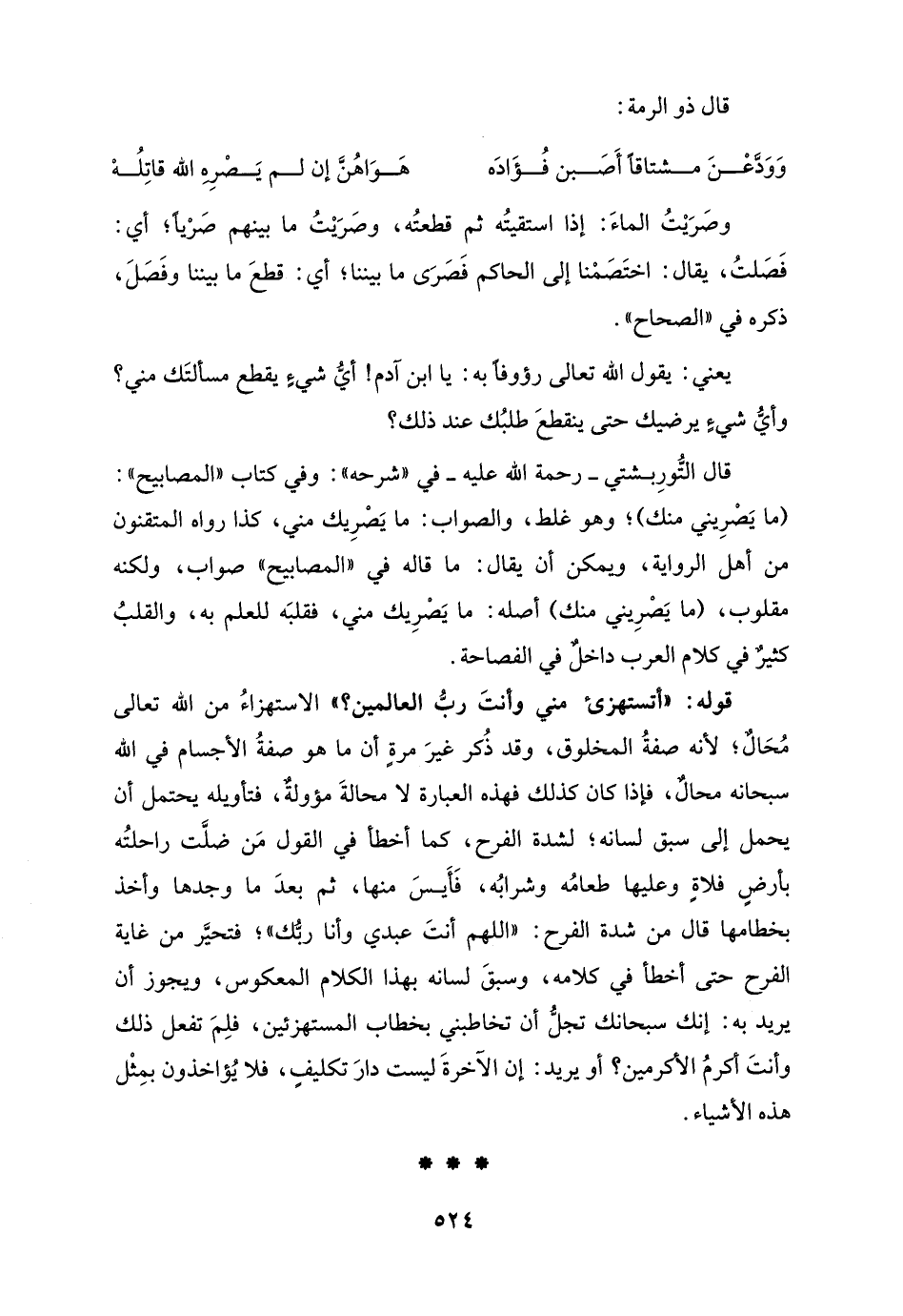 قوله: "أتستهزئ مني وأنتَ ربُّ العالمين؟ " الاستهزاءُ من الله تعالى مُحَالٌ؛ لأنه صفةُ المخلوق، وقد ذُكر غيرَ مرةٍ أن ما هو صفةُ الأجسام في الله سبحانه محالٌ، فإذا كان كذلك فهذه العبارة لا محالةَ مؤولةٌ، فتأويله يحتمل أن يحمل إلى سبق لسانه؛ لشدة الفرح، كما أخطأ في القول مَن ضلَّت راحلتُه بأرضٍ فلاةٍ وعليها طعامُه وشرابُه، فَأيسَ منها، ثم بعدَ ما وجدها وأخذ بخطامها قال من شدة الفرح: "اللهم أنتَ عبدي وأنا ربُّك"؛ فتحيَّر من غاية الفرح حتى أخطأ في كلامه، وسبقَ لسانه بهذا الكلام المعكوس، ويجوز أن يريد به: إنك سبحانك تجلُّ أن تخاطبني بخطاب المستهزئين، فلِمَ تفعل ذلك وأنتَ أكرم الأكرمين؟ أو يريد: إن الآخرةَ ليست دارَ تكليفٍ، فلا يُؤاخذون بمِثْل هذه الأشياء.