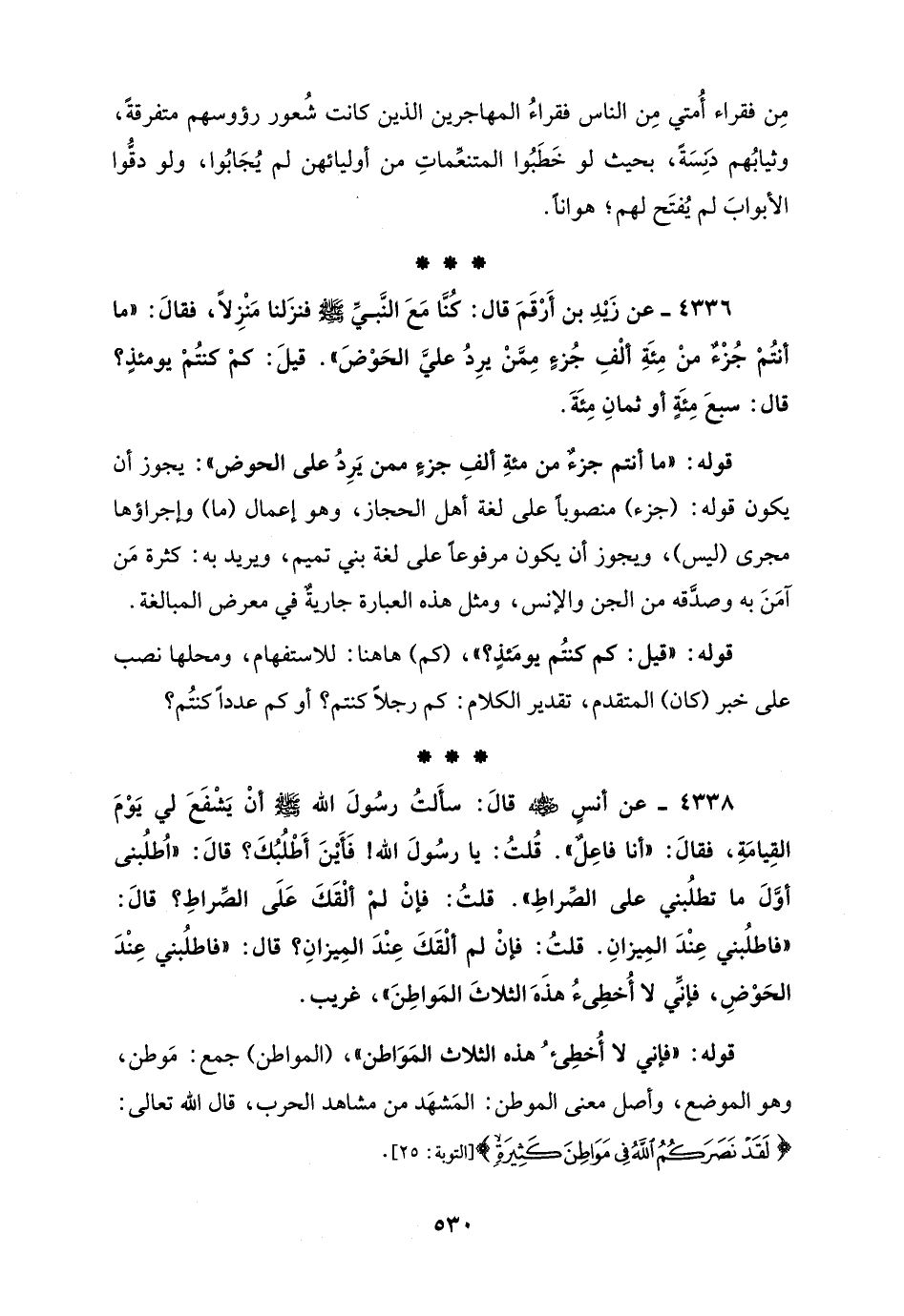 4338 - عن أنسٍ - رضي الله عنه - قالَ: سأَلتُ رسُولَ الله - صلى الله عليه وسلم - أنْ يَشْفَعَ لي يَوْمَ القِيامَةِ، فقالَ: "أنا فاعِلٌ". قُلتُ: يا رسُولَ الله! فَأَيْنَ أَطْلُبُكَ؟ قالَ: "اُطلُبنى أوَّلَ ما تطلُبني على الصِّراطِ". قلتُ: فإنْ لمْ ألْقَكَ عَلَى الصِّراطِ؟ قالَ: "فاطلُبني عِنْدَ المِيزانِ. قلتُ: فإنْ لم ألْقَكَ عِنْدَ المِيزانِ؟ قال: "فاطلُبني عِنْدَ الحَوْضِ، فإنَّي لا أُخطِئُ هذَهَ الثلاثَ المَواطِنَ"، غريب.