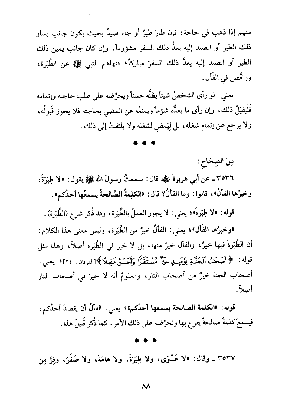 3536 - عن أبي هريرةَ - رضي الله عنه - قال: سمعتُ رسولَ الله - صلى الله عليه وسلم - يقول: "لا طِيَرَةَ، وخيرُها الفألُ"، قالوا: وما الفألُ؟ قال: "الكلِمةُ الصَّالحةُ يسمعُها أحدُكم".