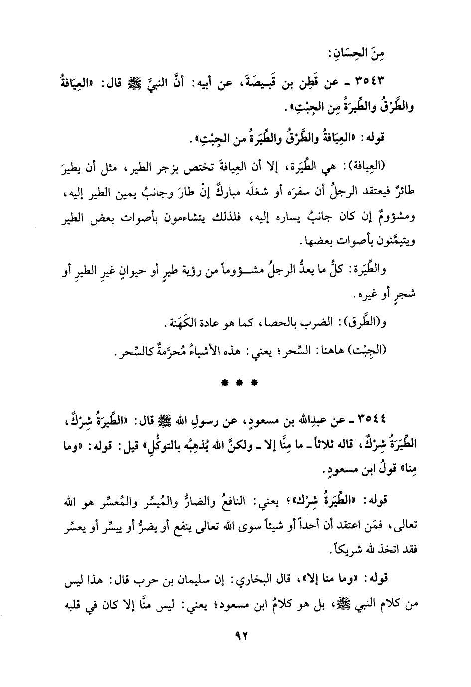 3543 - عن قَطِن بن قَبيصَةَ، عن أبيه: أنَّ النبيَّ - صلى الله عليه وسلم - قال: "العِيَافةُ والطَّرْقُ والطِّيرَةُ مِن الجِبْتِ".