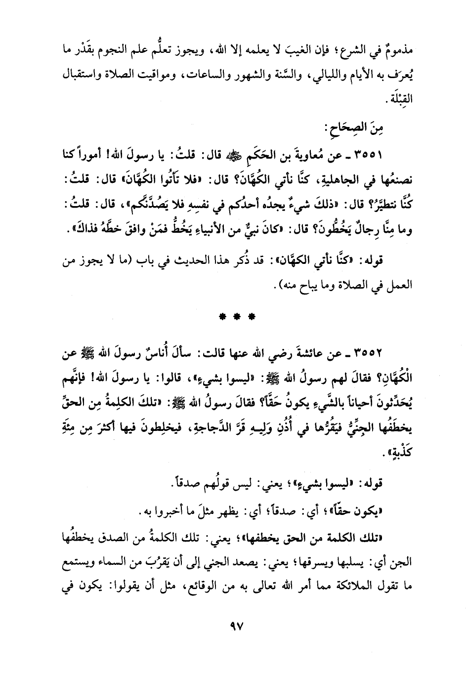 3552 - عن عائشةَ رضي الله عنها قالت: سألَ أُناسٌ رسولَ الله - صلى الله عليه وسلم - عن الْكُهَّانِ؟ فقالَ لهم رسولُ الله - صلى الله عليه وسلم -: "ليسوا بشيءٍ"، قالوا: يا رسولَ الله! فإنَّهم يُحَدِّثونَ أحيانًا بالشَّيءِ يكونُ حَقًّا؟ فقالَ رسولُ الله - صلى الله عليه وسلم -: "تلكَ الكلِمةُ مِن الحقِّ يخطَفُها الجِنِّيُّ فيَقُرُّها في أُذُنِ وَلِيهِ قَرَّ الدَّجاجةِ، فيخلِطونَ فيها أكثرَ مِن مِئَةِ كَذْبةٍ".