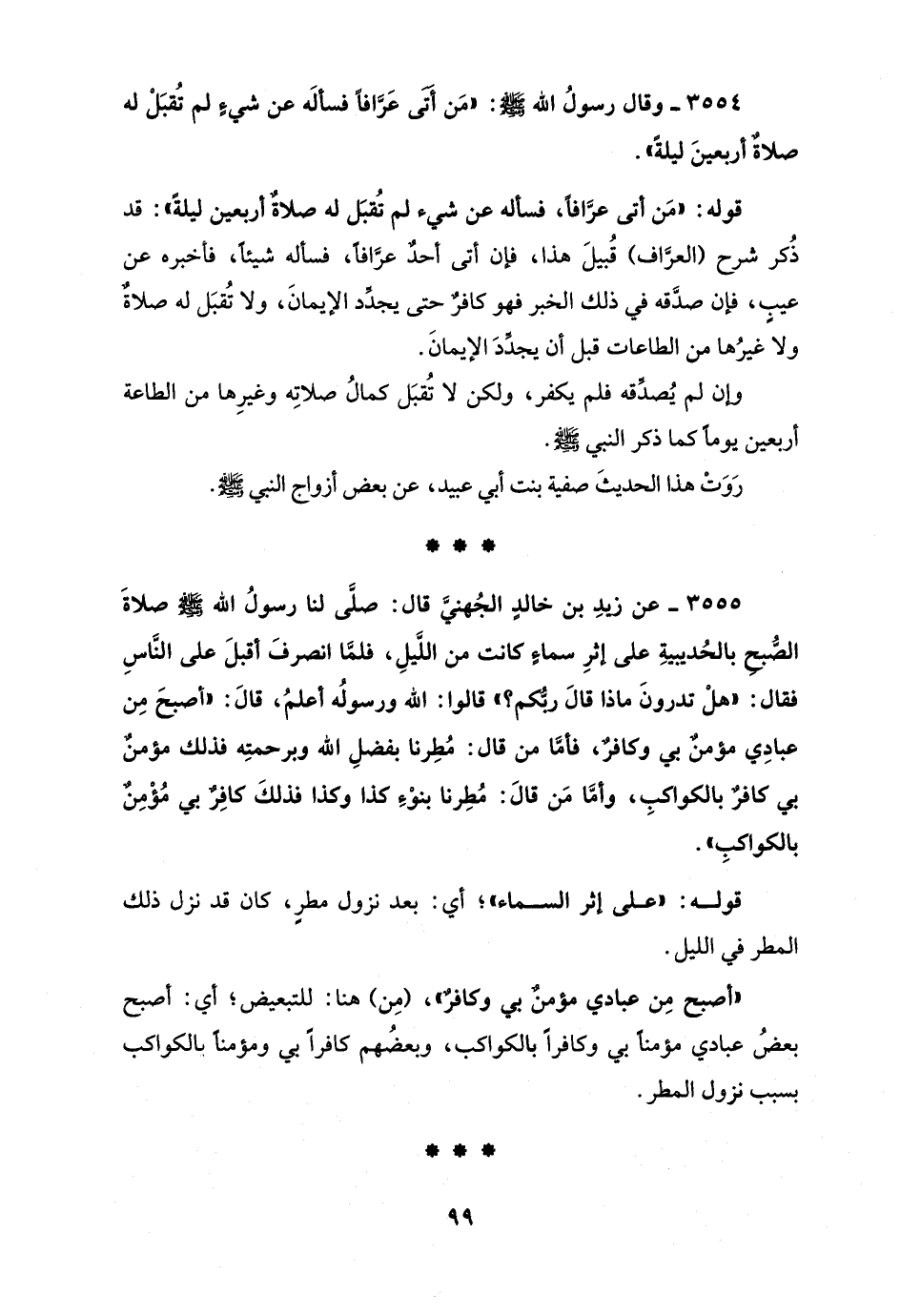 3555 - عن زيدِ بن خالدٍ الجُهنيَّ قال: صلَّى لنا رسولُ الله - صلى الله عليه وسلم - صلاةَ الصُّبحِ بالحُديبيةِ على إثرِ سماءٍ كانت من اللَّيلِ، فلمَّا انصرفَ أقبلَ على النَّاسِ فقال: "هلْ تدرونَ ماذا قالَ ربُّكم؟ " قالوا: الله ورسولُه أعلمُ، قالَ: "أصبحَ مِن عبادِي مؤمنٌ بي وكافرٌ، فأمَّا من قال: مُطِرنا بفضلِ الله وبرحمتِه فذلك مؤمنٌ بي كافرٌ بالكواكبِ، وأمَّا مَن قالَ: مُطِرنا بنوْءِ كذا وكذا فذلكَ كافِرٌ بي مُؤْمِنٌ بالكواكبِ".