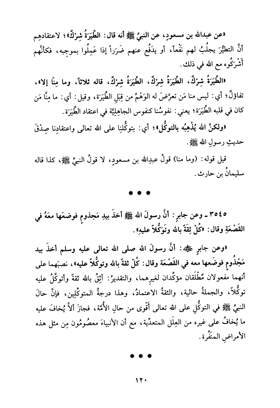 "عن عبد الله بن مسعودٍ، عن النبيِّ - صلى الله عليه وسلم - أنَّه قال: الطِّيَرَةُ شِرْكٌ"؛ لاعتقادهِم أنَّ التطيُّرَ يجلُبُ لهم نَفْعًا، أو يدَفُع عنهم ضَرَرًا إذا عَمِلُوا بموجِبه، فكأنَّهم أَشْرَكُوه مع الله في ذلك.