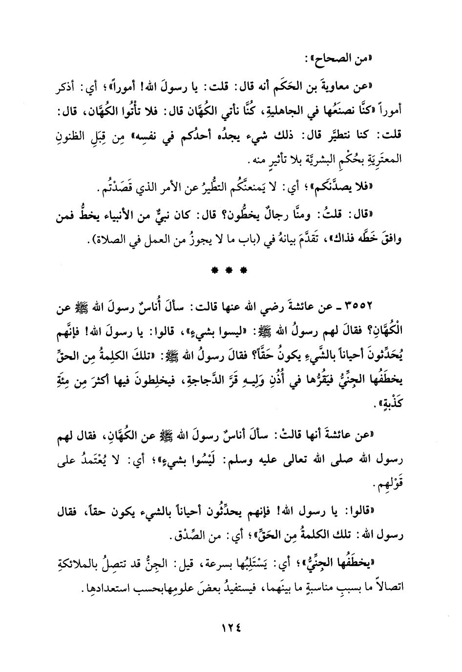 3552 - عن عائشةَ رضي الله عنها قالت: سألَ أُناس رسولَ الله - صَلَّى الله عليه وسلم - عن الْكُهانِ؟ فقالَ لهم رسولُ الله - صَلَّى الله عليه وسلم -: "ليسوا بشيءٍ"، قالوا: يا رسولَ الله! فإنَّهم يُحَدثونَ أحياناً بالشَّيءِ يكونُ حَقًّا؟ فقالَ رسولُ الله - صَلَّى الله عليه وسلم -: "تلكَ الكلِمةُ مِن الحقِّ يخطَفُها الجنِّيُّ فيقُرُّها في أُذُنِ وَلِيهِ قَرَّ الدَّجاجةِ، فيخلِطونَ فيها أكثرَ مِن مِئَةِ كَذْبةٍ".