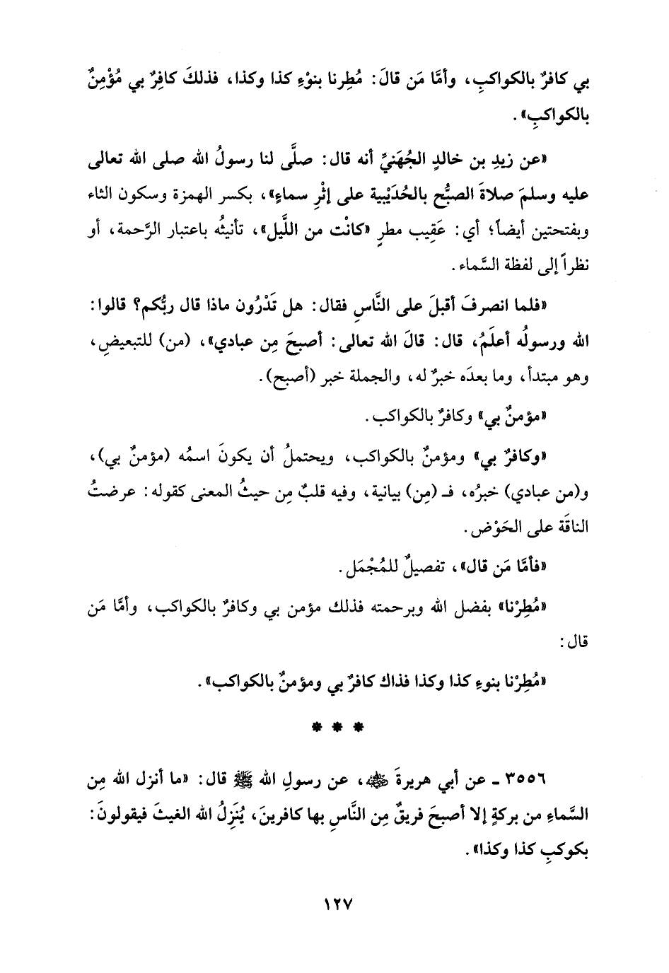 "مُطِرْنا بنوء كذا وكذا فذاك كافرٌ بي ومؤمن بالكواكب".