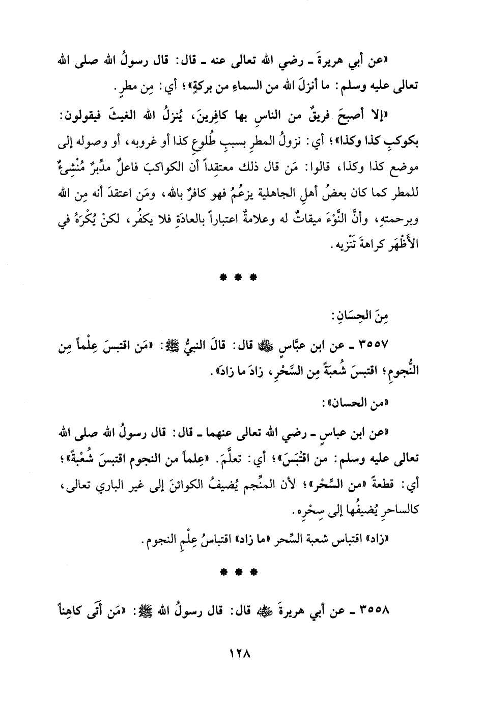 3557 - عن ابن عبَّاسٍ - رضي الله عنه - قال: قالَ النبيُّ - صلى الله عليه وسلم -: "مَن اقتبسَ عِلْماً مِن النُّجومِ؛ اقتبسَ شُعبةً مِن السَّحْرِ، زادَ ما زادَ".