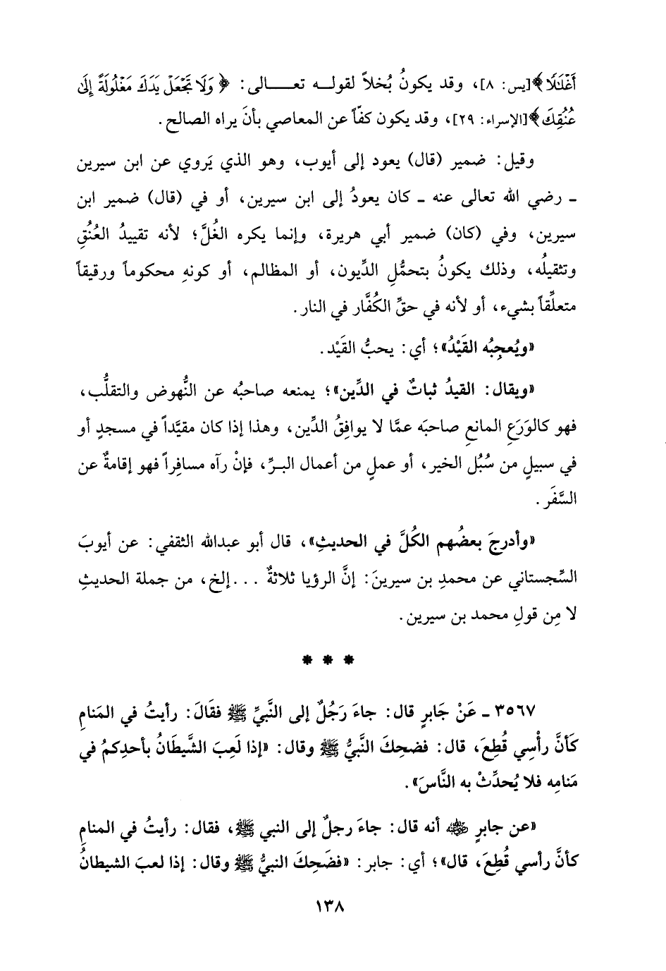 3567 - عَنْ جَابرٍ قال: جاءَ رَجُلٌ إلى النَّبيِّ - صلى الله عليه وسلم - فقَالَ: رأيتُ في المَنامِ كَأنَّ رأْسِي قُطِعَ، قال: فضحِكَ النَّبيُّ - صَلَّى الله عليه وسلم - وقال: "إذا لَعِبَ الشَّيطَانُ بأحدِكمُ في مَنامِه فلا يُحدِّثْ به النَّاسَ".