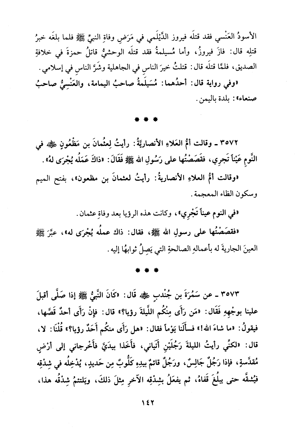 3572 - وقالت أمُّ العَلاءَ الأنصاريَّةُ: رأيتُ لِعثُمانَ بن مَظْعُونٍ - رضي الله عنه - في النَّومِ عَيْناً تَجرِي، فقَصَصْتُها على رَسُولِ الله - صَلَّى الله عليه وسلم - فَقَالَ: "ذاكَ عَمَلُه يُجْرَى لهُ".