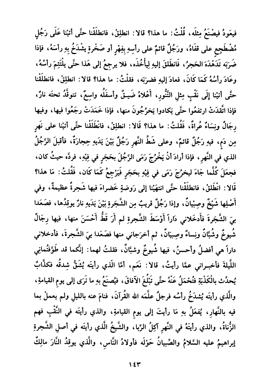 فيعَودُ فيصْنَعُ مِثلَه، قُلْتُ: ما هذا؟ قالا: انطلِقْ، فانطلَقْنا حتَّى أتيْنا عَلَى رَجُلٍ مُضْطَجعٍ على قفَاهُ، ورَجُلٌ قائمٌ على رأسِهِ بِفِهْرٍ أو صَخْرةٍ يشْدَخُ بِهِ رأسَهُ، فإذا ضَرَبَه تَدَهْدَهَ الحَجرُ، فَانطَلقَ إليهِ لِيأْخُذَه، فلا يرجِعُ إلى هَذا حتَّى يلْتَئِمَ رأسُهُ، وعَادَ رأسُهُ كَمَا كَانَ، فعادَ إليهِ فضرَبَه، فقلْتُ: ما هذا؟ قالا: انطلِقْ، فانطلَقْنا حتَّى أتيْنا إلَى نَقْبٍ مِثلِ التَّنُّورِ، أَعْلاهُ ضَيقٌ وأسفَلُه واسِعٌ، تتوقَّدُ تحتَه نارٌ، فإذا اتَّقدَتْ ارتفعُوا حتَّى يَكادوا يَخرُجُونَ منها، فإذا خَمَدَتْ رجَعُوا فيها، وفيها رِجَالٌ ونسَاءٌ عُراةٌ، فَقُلتُ: ما هذا؟ قَالا: انطلِقْ، فانْطَلَقْنا حتَّى أتيْنا على نَهرٍ مِن دَمٍ، فيهِ رَجُل قائمٌ، وعلى شَطِّ النَّهرِ رَجُل بَيْنَ يَدَيهِ حِجارَةٌ، فأقبلَ الرَّجُلُ الذي في النَّهرِ، فإذا أرادَ أنْ يَخْرُجَ رَمَى الرَّجُلَ بحَجَرٍ في فِيْهِ، فردَّه حيثُ كان، فجعَلَ كُلَّما جَاءَ ليخرُجَ رَمَى في فِيْهِ بحَجَرٍ فَيَرْجِعُ كَمَا كَان، فَقُلتُ: مَا هذا؟ قَالا: انْطَلقْ، فانطلَقْنا حتَّى انتهَيْنا إلى رَوضةٍ خَضراءَ فيها شَجرةٌ عظيمةٌ، وفي أَصْلِها شَيْخٌ وصِبْيانٌ، وإذا رَجُل قريبٌ مِن الشَّجَرةِ بَيْنَ يَدَيهِ نارٌ يوقدُها، فصَعَدا بيَ الشَّجَرةَ فأَدخَلاني دارًا أَوْسَطَ الشَّجرةِ لم أَرَ قَطُّ أَحْسَنَ منها، فيها رِجَالٌ شُيوخٌ وشُبَّانٌ ونِساءٌ وصِبيَانٌ، ثم أخرَجاني منها فصَعَدا بيَ الشَّجرةَ، فأدخلاني دارًا هي أفضلُ وأحسنُ، فيها شُيوخٌ وشبَّانٌ، فقلتُ لهما: إنَّكما قد طَوَّفتُمانِي اللَّيلةَ فأخبراني عمَّا رأيتُ، قالا: نعم، أمَّا الّذي رأيتَه يُشَقُّ شِدقُه فكذَّابٌ يُحدث بالْكَذْبَةِ فتُحْمَلُ عَنْهُ حتَّى تَبْلُغَ الآفاقَ، فيُصنَعُ بهِ ما تَرَى إلى يومِ القيامةِ، والَّذي رأيتَه يُشدَخُ رأسُه فرجلٌ علَّمَه الله القُرآنَ، فنامَ عنه بالليلِ ولم يعملْ بما فيه بالنَّهارِ، يُفعَلُ بهِ مَا رأيتَ إلى يومِ القيامةِ، والذي رأيتَه في النَّقْبِ فهم الزُّناةُ، والذي رأيتَهُ في النَّهرِ آكلُ الرِّبا، والشَّيخُ الَّذي رأيتَه في أصلِ الشَّجرةِ إبراهيمُ عليه السَّلامُ والصِّبيانُ حَوْلَه فأولادُ النَّاسِ، والَّذي يوقِدُ النَّارَ مالِكٌ