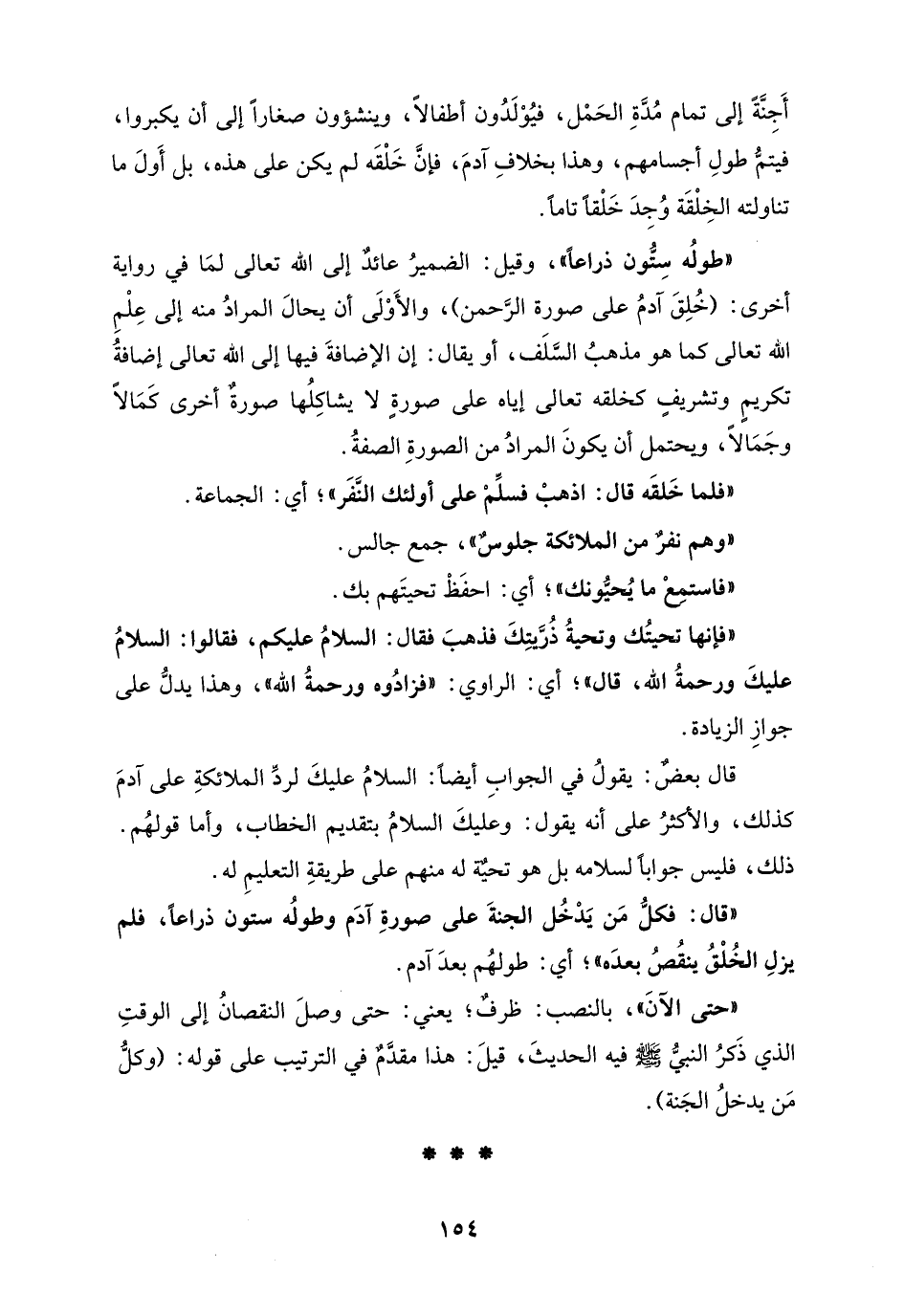 "طولُه سِتُّون ذراعاً"، وقيل: الضميرُ عائدٌ إلى الله تعالى لمَا في رواية أخرى: (خُلِقَ آدمُ على سورة الرَّحمن)، والأَوْلَى أن يحالَ المرادُ منه إلى عِلْمِ الله تعالى كما هو مذهبُ السَّلَف، أو يقال: إن الإضافةَ فيها إلى الله تعالى إضافةُ تكريمٍ وتشريفٍ كخلقه تعالى إياه على سورة لا يشاكِلُها صورةٌ أخرى كَمَالاً وجَمَالاً، ويحتمل أن يكونَ المرادُ من الصورةِ الصفةُ.