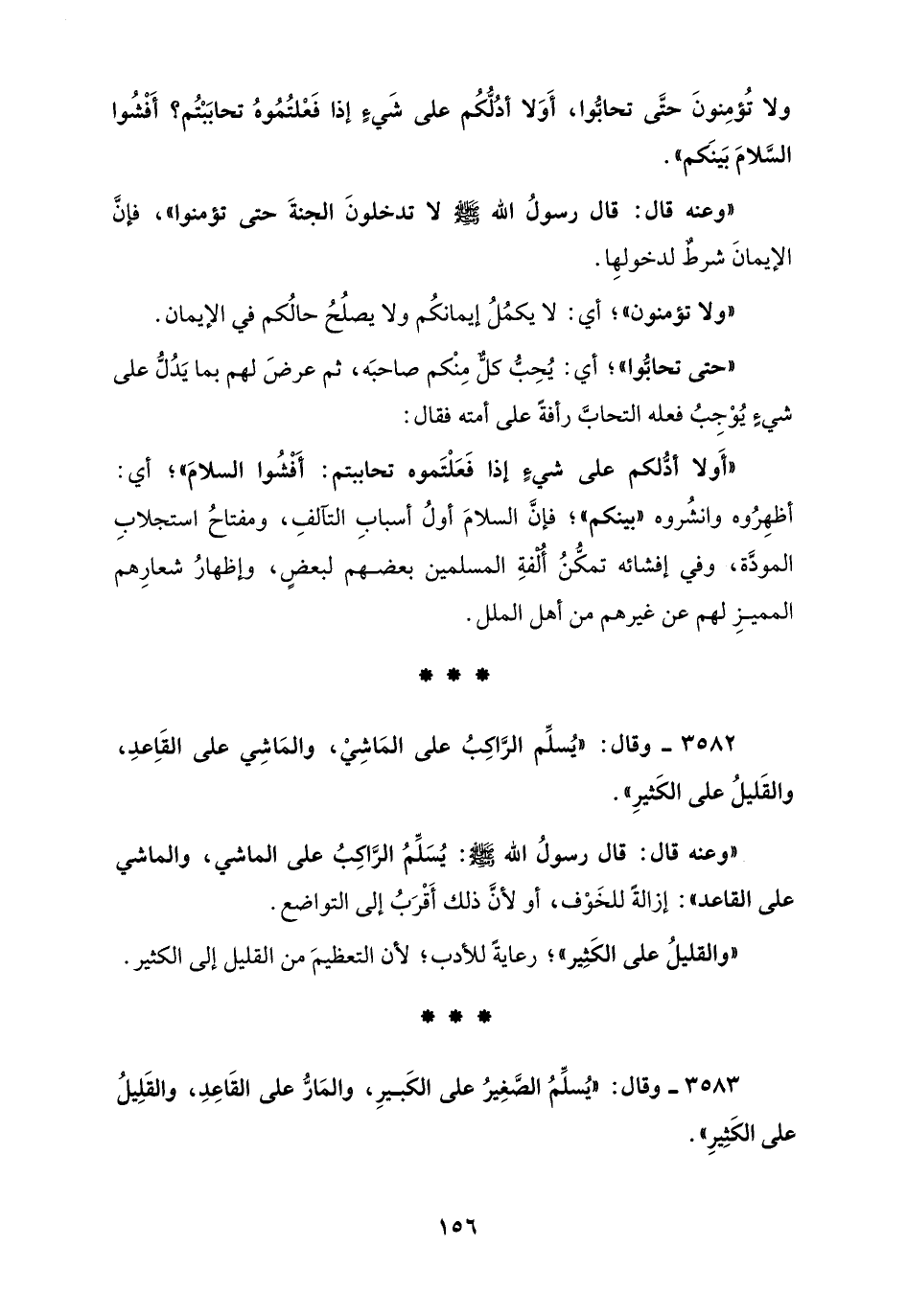 3582 - وقال: "يُسلِّم الرَّاكِبُ على المَاشِيْ، والمَاشِي على القَاِعدِ، والقَليلُ على الكَثيرِ".