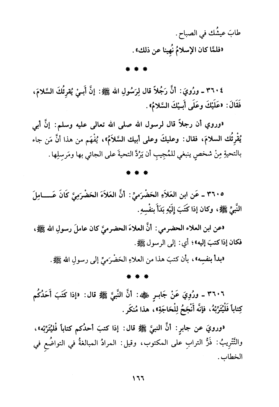 3605 - عَن ابن العَلاَءِ الحَضْرَميِّ: أنَّ العَلاَءَ الحَضْرَمِيَّ كَانَ عَامِلَ النَّبيِّ - صَلَّى الله عليه وسلم -، وكان إذا كتَبَ إلَيْهِ بَدَأَ بنفْسِهِ.