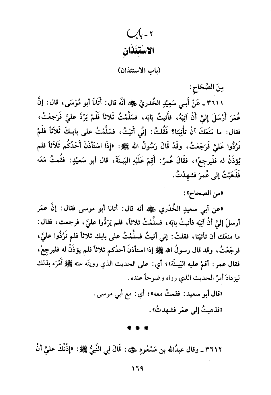 3611 - عَنْ أَبي سَعِيْدٍ الخُدريِّ - رضي الله عنه - أنَّه قال: أتانَا أبو مُوْسَى، قال: إنَّ عُمَرَ أَرْسَلَ إِليَّ أَنْ آتِيَهُ، فأتيتُ بَابَه، فسَلَّمْتُ ثَلاثاً فَلَمْ يَرُدَّ عليَّ فَرَجعْتُ، فقال: ما مَنَعَكَ أنْ تأتِيَنا؟ فَقُلتُ: إنِّي أَتيْتُ، فسَلَّمْتُ على بابكَ ثَلاَثاً فلَمْ تَرُدُّوا عَليَّ فَرَجَعْتُ، وقَدْ قَالَ رَسُولُ الله - صَلَّى الله عليه وسلم -: "إِذَا اسْتَأذَنَ أَحَدُكُم ثَلاَثاً فلم يُؤذَنْ له فلْيرجِعْ" فقَالَ عُمرُ: أَقِمْ عَلَيْهِ البَينَةَ، قال أبو سَعيْدٍ: فقُمتُ مَعَه فَذَهَبْتُ إلى عُمرَ فشهِدْتُ.
