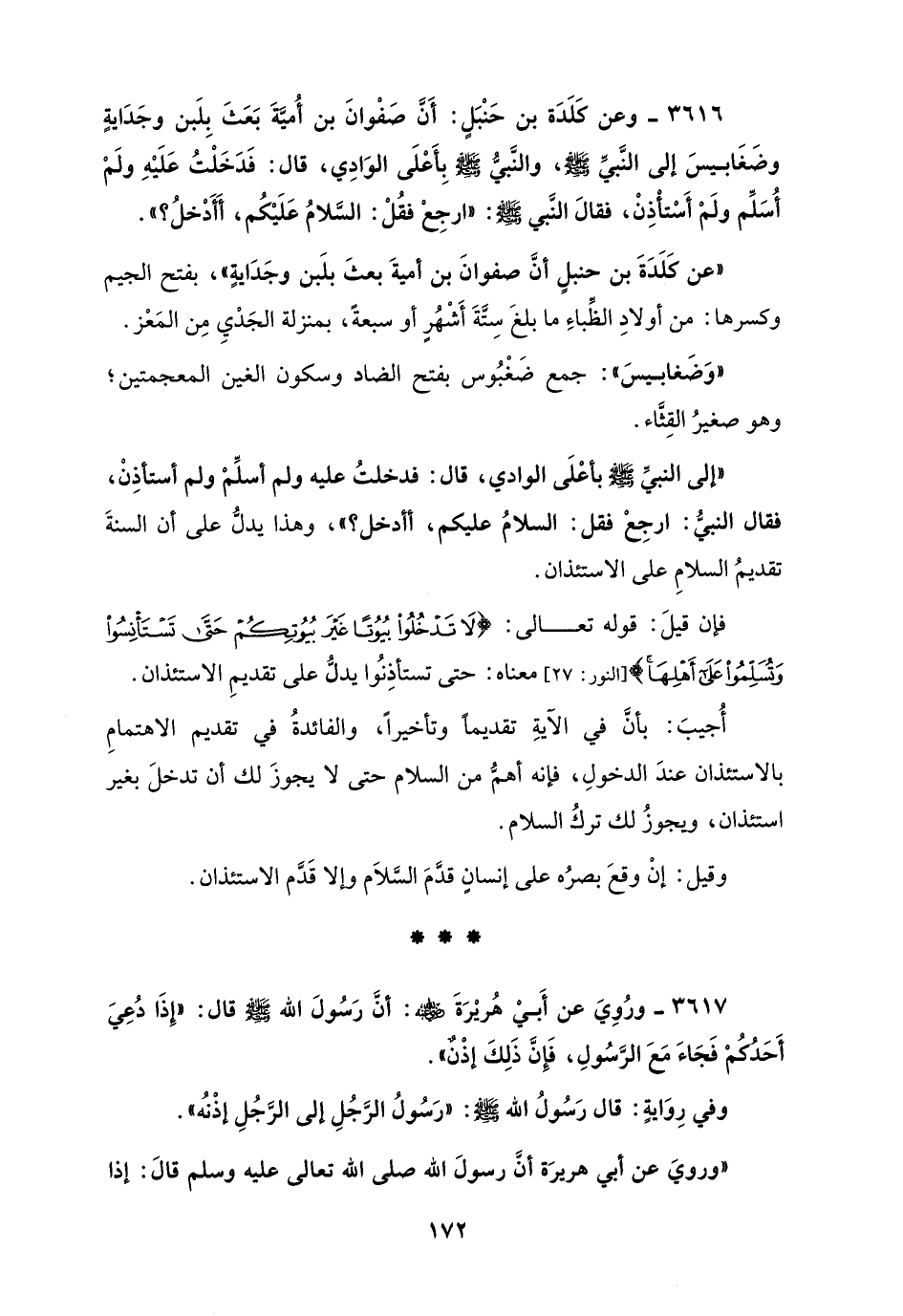 3616 - وعَنْ كَلَدَةَ بْنِ حَنْبَلٍ: أَنَّ صَفْوَانَ بْنَ أُمَيَّةَ بَعَثَ بِلَبَن وَجَدَايَةٍ وَضَغَابِيسَ إِلَى النَّبِيِّ صَلَّى اللهُ عَلَيْهِ وَسَلَّمَ، وَالنَّبِيُّ بِأَعْلَى الوَادِي، قَالَ: فَدَخَلْتُ عَلَيْهِ وَلَمْ أُسَلِّمْ وَلَمْ أَسْتَأْذِنْ، فَقَالَ النَّبِيِّ - صلى الله عليه وسلم -: "ارْجِعْ فَقُلْ: السَّلَامُ عَلَيْكُمْ، أَأَدْخُلُ؟ ".