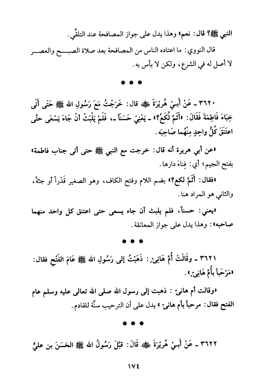 3620 - عَنْ أَبِيْ هُريْرَةَ رضي الله عنه قال: خَرَجْتُ مَعَ رَسُولِ الله - صلى الله عليه وسلم - حَتَّى أتى خِبَاءَ فَاطِمَةَ فَقَالَ: "أثمَّ لُكَعُ؟ " -يَعْنِيْ حَسَنًا-، فَلَمْ يَلْبَثْ أنْ جَاءَ يَسْعَى حتَّى اعتَنَقَ كُلُّ واحِدٍ مِنْهُما صَاحِبَه.