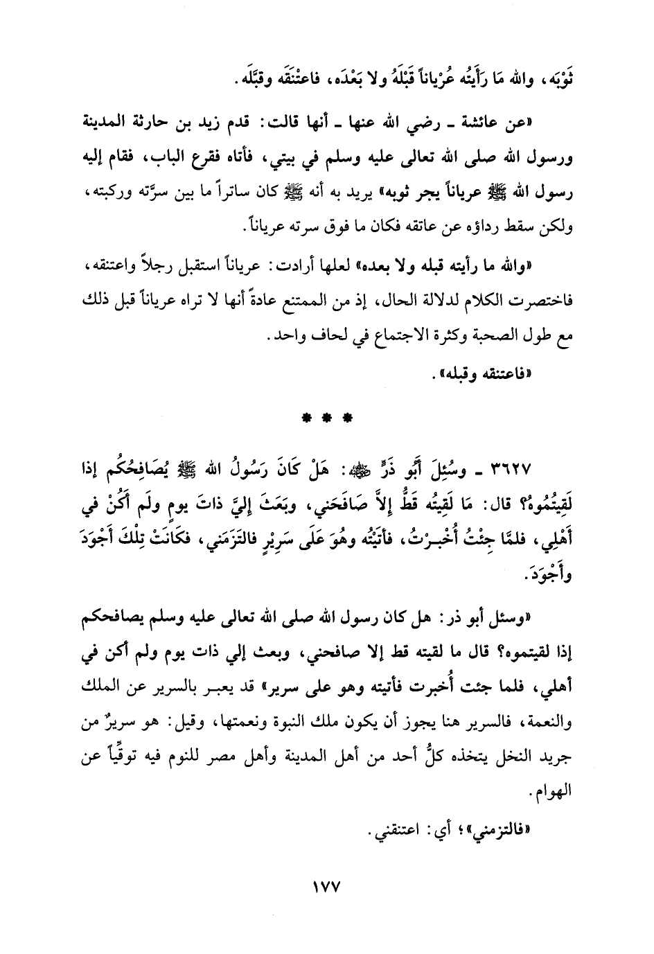 "عن عائشة - رضي الله عنها - أنها قالت: قدم زيد بن حارثة المدينة ورسول الله صلى الله تعالى عليه وسلم في بيتي، فأتاه فقرع الباب، فقام إليه رسول الله صلى الله عليه وسلم عرياناً يجر ثوبه" يريد به أنه - صلى الله عليه وسلم - كان ساتراً ما بين سرَّته وركبته، ولكن سقط رداؤه عن عاتقه فكان ما فوق سرته عرياناً.