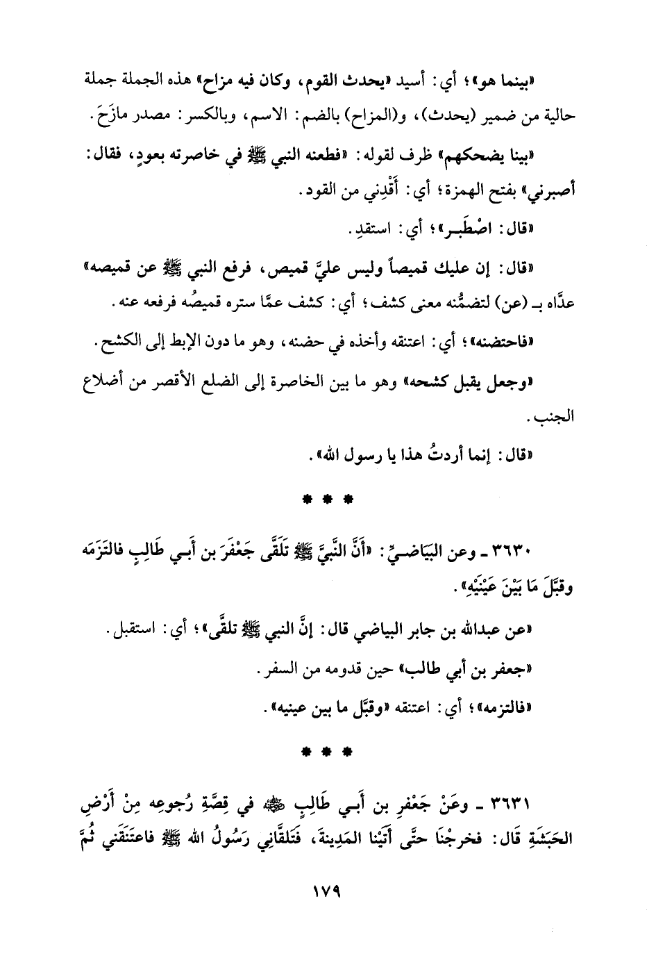 3631 - وعَنْ جَعْفرِ بن أَبي طَالِبٍ - رضي الله عنه - في قِصَّةِ رُجوعِه مِنْ أَرْضِ الحَبَشَةِ قَال: فخرجْنَا حتَّى أتيْنا المَدِينةَ، فتَلقَّانِي رَسُولُ الله - صلى الله عليه وسلم - فاعتَنَقَني ثُمَّ