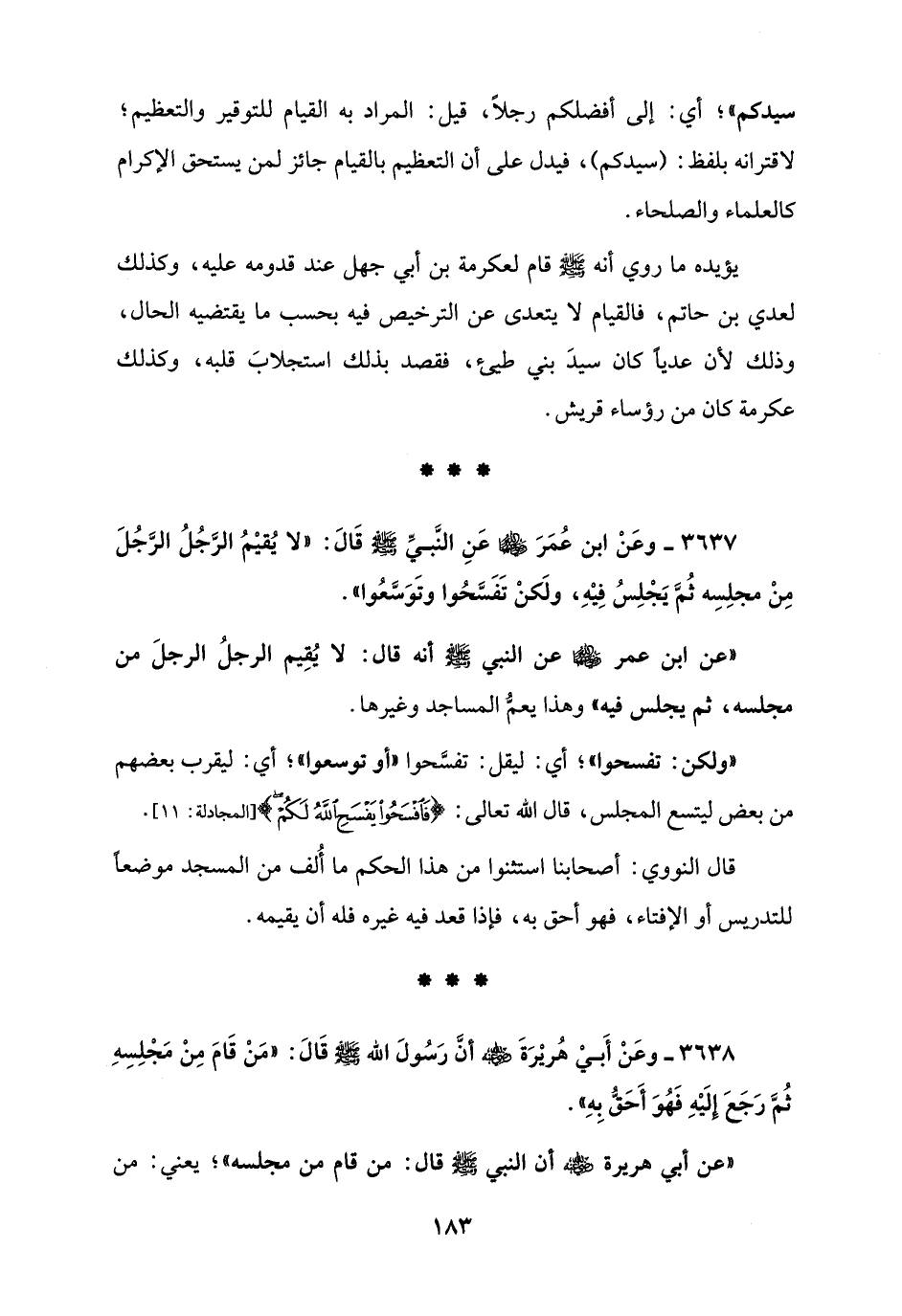 3637 - وعَنْ ابن عُمَرَ عَنِ النَّبيِّ صلى الله عليه وسلم قَالَ: "لا يُقيْمُ الرَّجُلُ الرَّجُلَ مِنْ مجلِسِه ثُمَّ يَجْلِسُ فِيْهِ، ولَكنْ تَفَسَّحُوا وتَوَسَّعُوا".