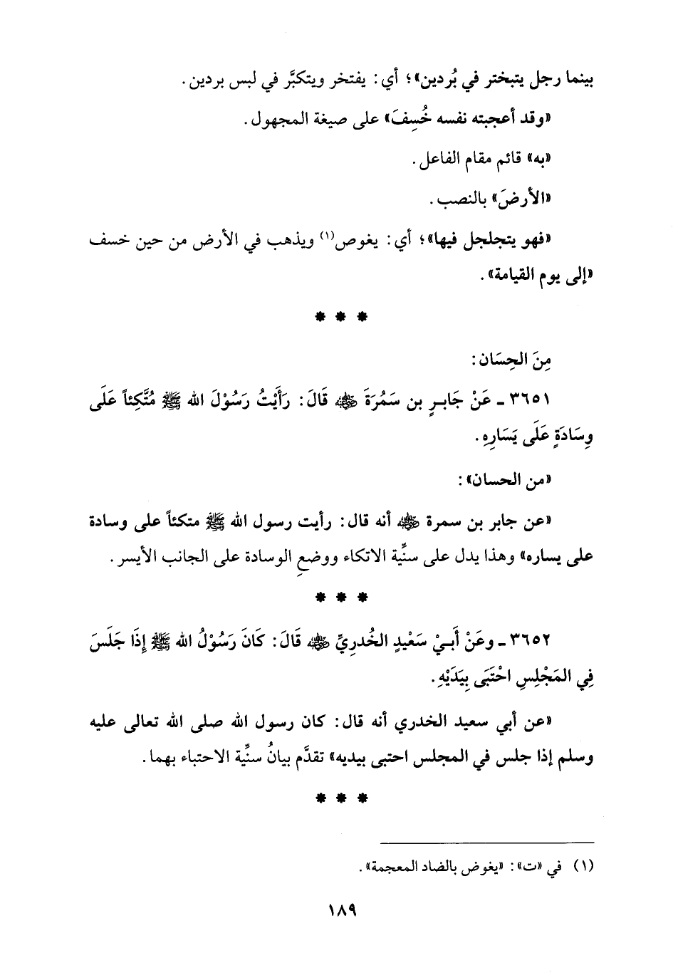 3651 - عَنْ جَابرٍ بن سَمُرَةَ - رضي الله عنه - قَالَ: رَأَيْتُ رَسُوْلَ الله - صلى الله عليه وسلم - مُتَّكِئًا عَلَى وِسَادَة عَلَى يَسَار.