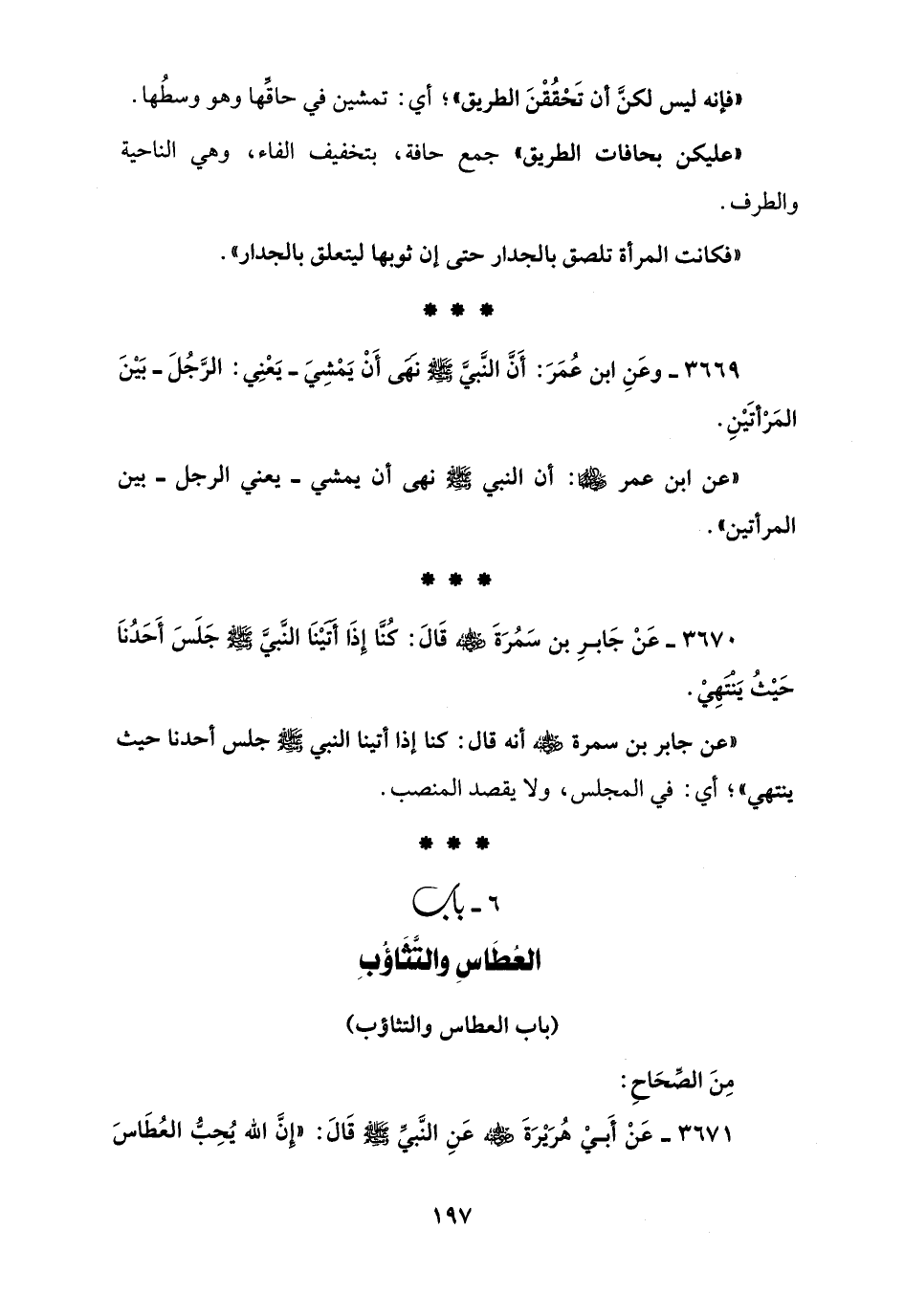 3669 - وعَنِ ابن عُمَرَ: أَنَّ النَّبيَّ صلى الله عليه وسلم نهى أَنْ يَمْشِيَ -يَعْنِي: الرَّجُلَ- بَيْنَ المَرْأتَيْنِ.