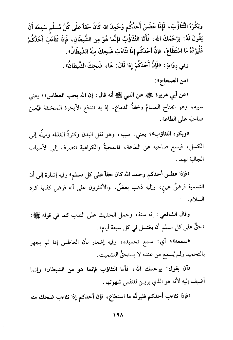 ويَكْرَهُ التَّثَاؤُبَ، فَإذَا عَطَسَ أَحَدُكُم وَحَمِدَ الله كَانَ حَقاً علَى كُلِّ مُسلْمٍ سَمِعَه أَنْ يَقُولَ لَهُ: يَرْحَمُكَ الله، فَأَمَّا التَّثَاؤُبُ فإنَّما هُوَ مِن الشَّيطَانِ، فَإِذَا تَثَاءَبَ أَحَدُكُمْ فَلْيَرُدَّهُ مَا اسْتَطَاعَ، فإنَّ أحَدُكُم إِذَا تَثَاءَبَ ضَحِكَ مِنْهُ الشَّيطَانُ".