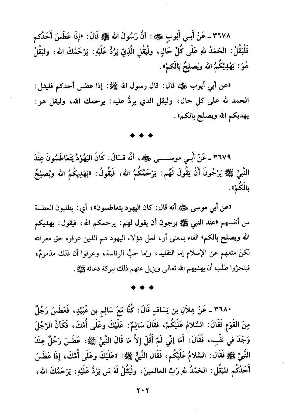 3679 - عَنْ أَبي موسى - رضي الله عنه -، أنَّه قَالَ: كَانَ اليَهُوْدُ يتَعَاطَسُونَ عِنْدَ النَّبيِّ صلى الله عليه وسلم يَرْجُونَ أَنْ يَقُولَ لَهُم: يَرْحَمُكُمُ الله، فَيَقُولُ: "يَهْدِيكُمُ الله ويُصلِحُ بالَكُمْ".