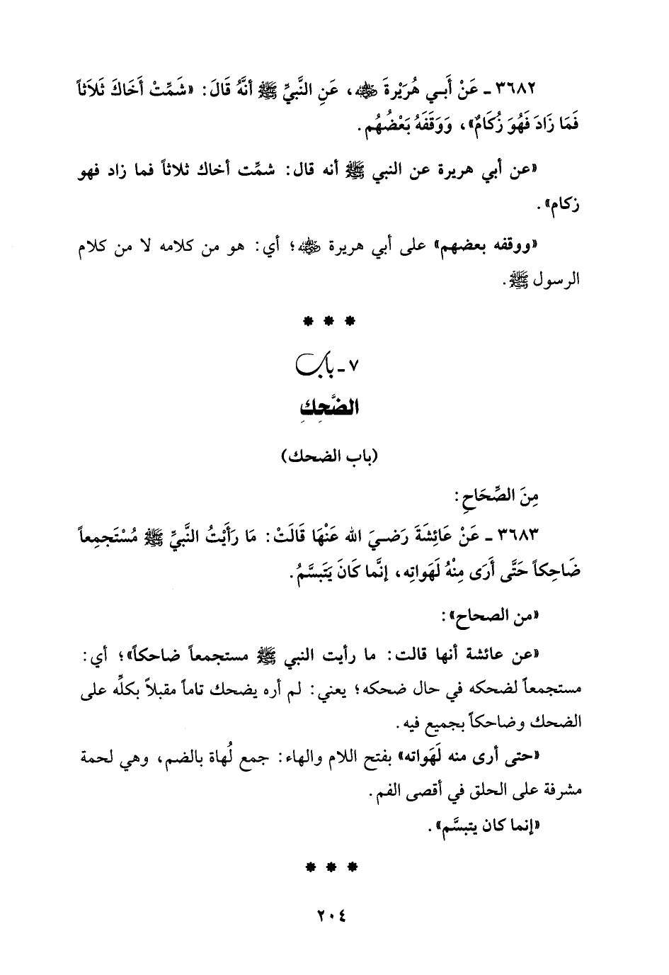 3683 - عَنْ عَائِشَةَ رَضيَ الله عَنْهَا قَالَتْ: مَا رَأَيْتُ النَّبيِّ - صلى الله عليه وسلم - مُسْتَجمِعاً ضَاحِكاً حَتَّى أَرَى مِنْهُ لَهَواتِه، إنَّما كَانَ يَتَبسَّمُ.
