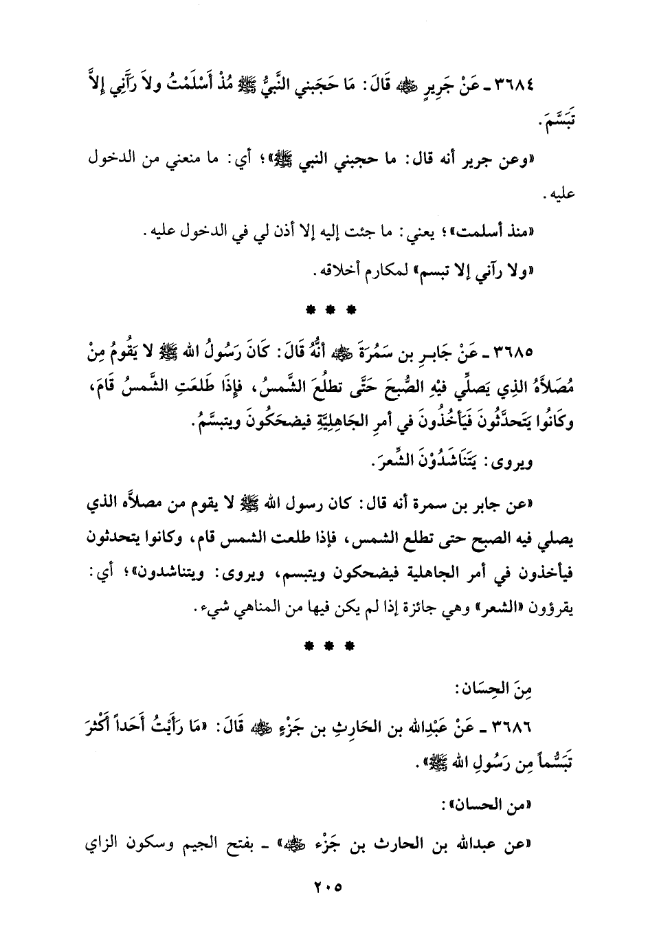 3686 - عَنْ عَبْدِ الله بن الحَارِثِ بن جَزْءٍ - رضي الله عنه - قَالَ: "مَا رَأَيْتُ أَحَدًا أَكثرَ تَبَسُّماً مِن رَسُولِ الله صلى الله عليه وسلم".