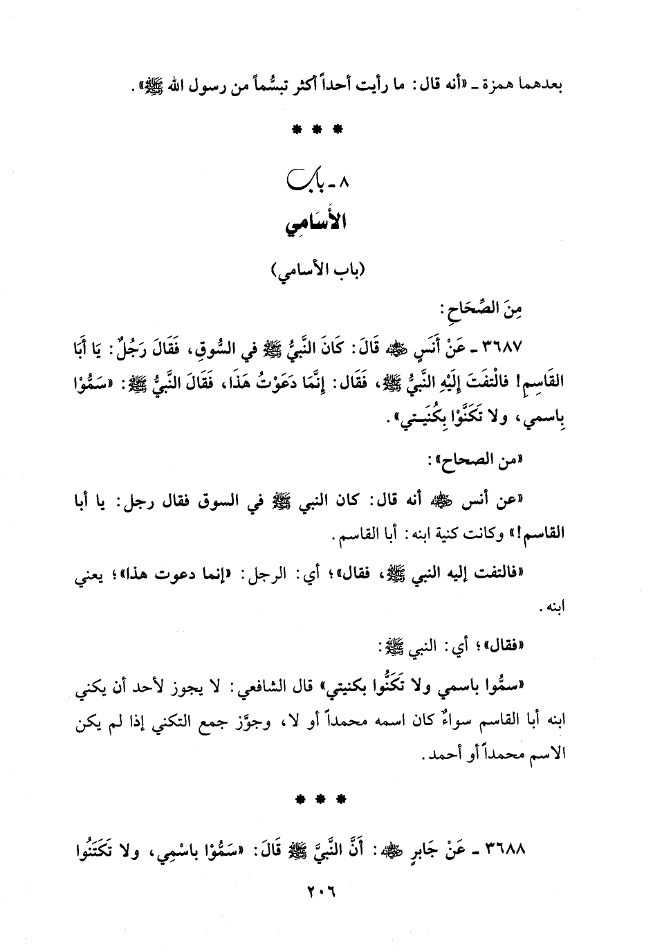 "سمُّوا باسمي ولا تَكَنُّوا بكنيتي" قال الشافعي: لا يجوز لأحد أن يكني ابنه أبا القاسم سواءٌ كان اسمه محمداً أو لا، وجوَّز جمع التكني إذا لم يكن الاسم محمداً أو أحمد.