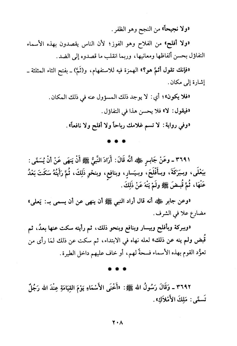 3691 - وعَنْ جَابرٍ - رضي الله عنه - أنَّه قَالَ: أَرَادَ النَّبيُّ صلى الله عليه وسلم أَنْ يَنهَى عَنْ أنْ يُسَمَّى: بيَعْلَى، وببَرَكَةَ، وبِأَفْلَحَ، وبيَسارٍ، وبنافِعٍ، وبنحْوِ ذَلِكَ، ثُمَّ رَأَيتُهُ سَكَتَ بَعْدُ عَنْهَا، ثُمَّ قُبضَ - صلى الله عليه وسلم - ولَمْ يَنْهَ عَنْ ذَلِكَ.