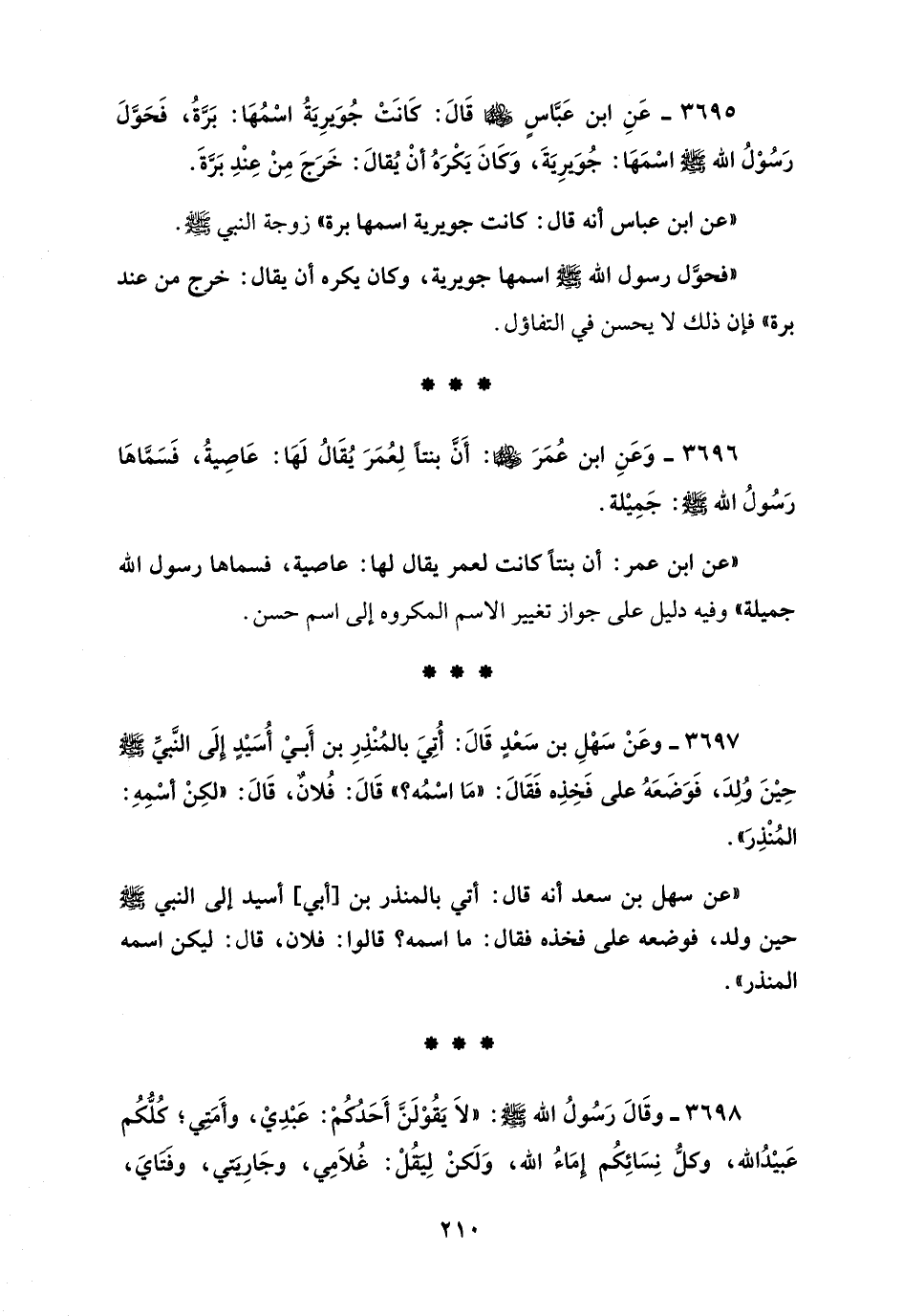 3695 - عَنِ ابن عَبَّاسٍ قَالَ: كَانَتْ جُوَيرِيَةُ اسْمُهَا: بَرَّةُ، فَحَوَّلَ رَسُوْلُ الله صلى الله عليه وسلم اسْمَهَا: جُوَيرِيَةَ، وَكَانَ يَكْرَهُ أنْ يُقالَ: خَرَجَ مِنْ عِنْدِ بَرَّةَ.