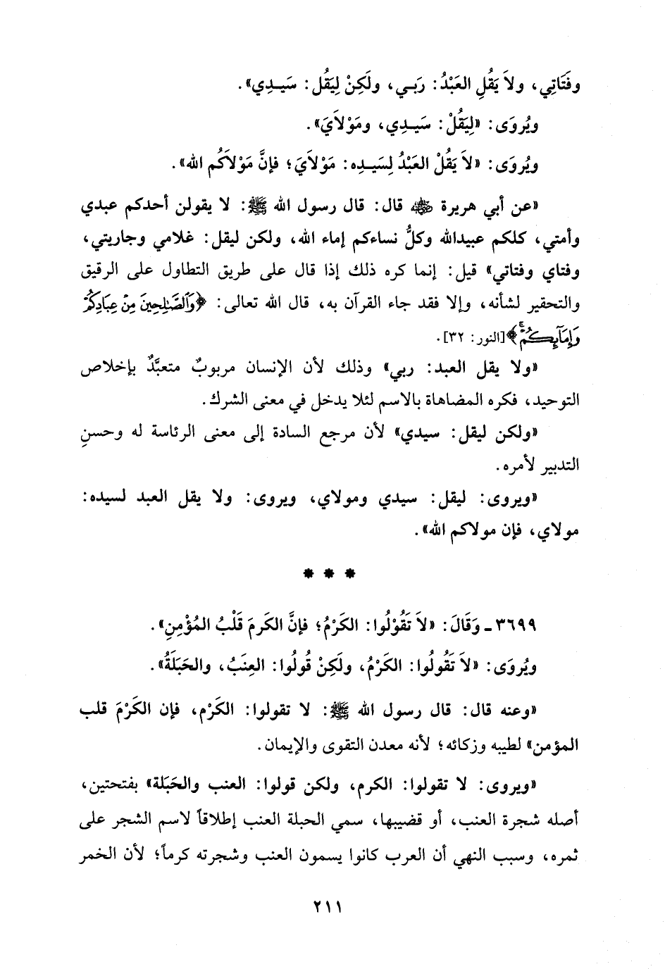 3699 - وَقَالَ: "لَا تَقُوْلُوا: الكَرْمُ؛ فإنَّ الكَرمَ قَلْبُ المُؤْمِنِ".