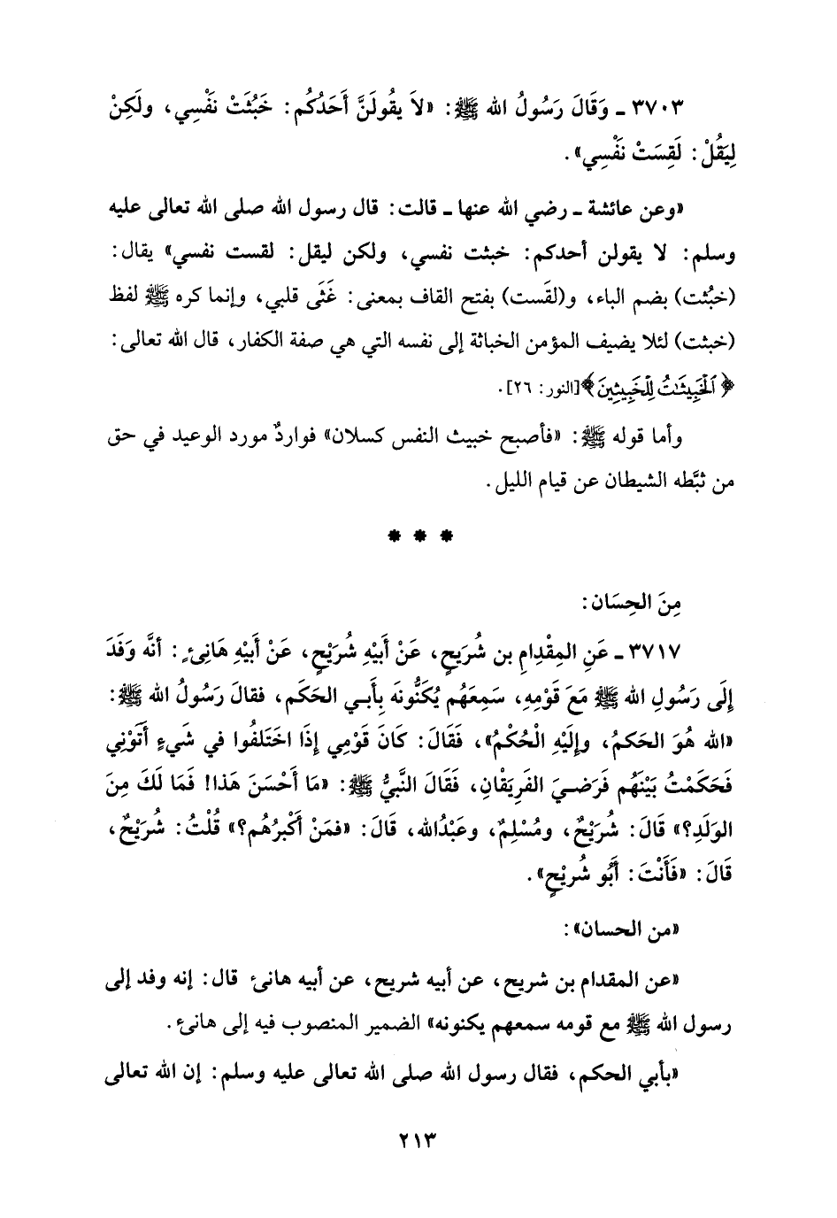 3717 - عَنِ المِقْدِامِ بن شُرَيحٍ، عَنْ أَبيْهِ شُرَيْحٍ، عَنْ أَبيْهِ هَانِئٍ: أنَّه وَفَدَ إِلَى رَسُولِ الله - صلى الله عليه وسلم - مَعَ قَوْمِهِ، سَمِعَهُم يُكَنُّونهَ بِأبي الحَكَم، فقالَ رَسُولُ الله صلى الله عليه وسلم: "الله هُوَ الحَكمُ، وَإِلَيْهِ الْحُكْمُ"، فَقَالَ: كَانَ قَوْمِي إذَا اخَتَلفُوا في شَيء أتوْنِي فَحَكَمْتُ بَيْنَهُم فَرَضيَ الفَرِيَقْانِ، فَقَالَ النَّبيّ صلى الله عليه وسلم: "مَا أَحْسَنَ هَذا! فَمَا لَكَ مِنَ الوَلَدِ؟ " قَالَ: شُرَيْحٌ، ومُسْلِمٌ، وعَبْدُ الله، قَالَ: "فمَنْ أكبرُهُم؟ " قُلْتُ: شُرَيْحٌ، قَالَ: "فَأَنْتَ: "لَو شُريْحٍ".