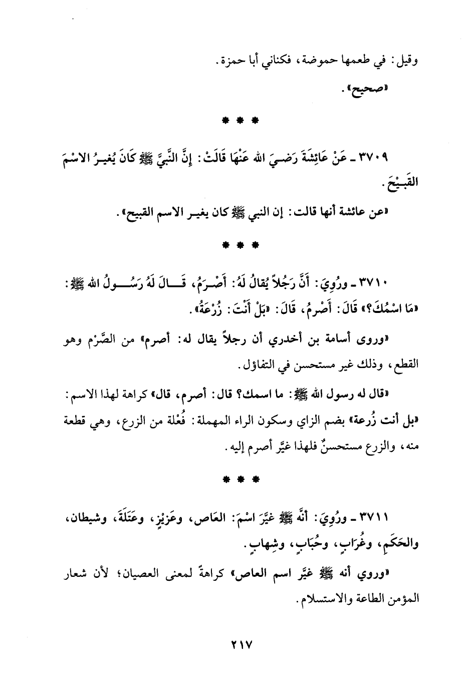 3711 - ورُوِيَ: أنَّه - صلى الله عليه وسلم - غيَّرَ اسْمَ: العَاص، وعَزيْزٍ، وعَتَلَةَ، وشيطان، والحَكَم، وغُرَابٍ، وحُبَابٍ، وشِهابٍ.