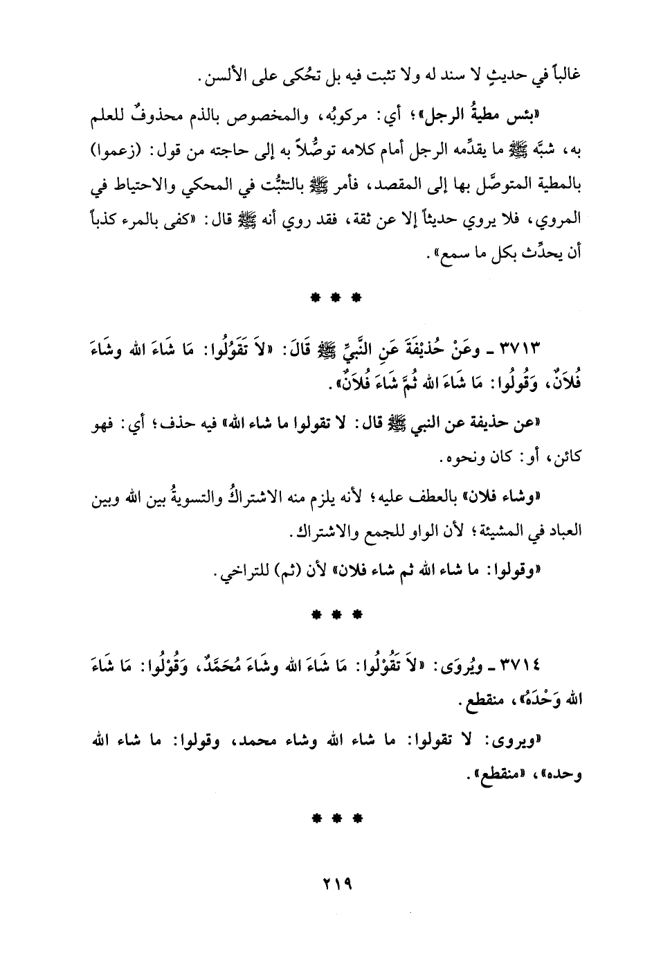 3713 - وعَنْ حُذيْفَةَ عَنِ النَّبيِّ صلى الله عليه وسلم قَالَ: "لَا تَقَوُلُوا: مَا شَاءَ الله وشَاءَ فُلَانٌ، وَقُولُوا: مَا شَاءَ الله ثُمَّ شَاءَ فُلَانٌ".