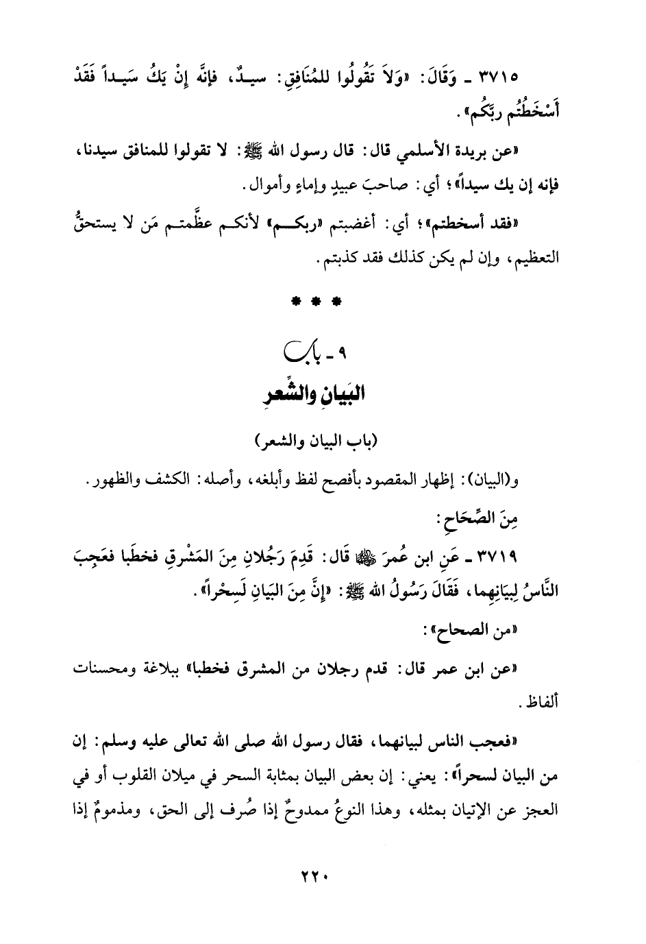 3719 - عَنِ ابن عُمرَ قَال: قَدِمَ رَجُلانِ مِنَ المَشْرقِ فخطَبا فعَجبَ النَّاسُ لِبيَانِهِما، فَقَالَ رَسُولُ الله صلى الله عليه وسلم: "إنَّ مِنَ البَيانِ لَسِحْراً".