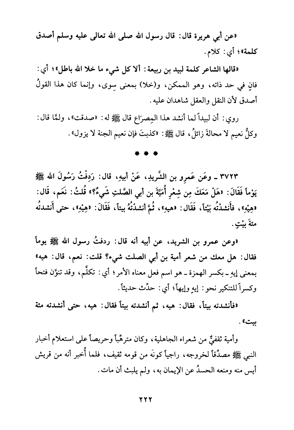 3723 - وعَن عَمرِو بن الشَّريدِ، عَنْ أبيهِ، قال: رَدِفْتُ رَسُولَ الله - صلى الله عليه وسلم - يَوْماً فَقَالَ: "هلْ مَعَكَ مِن شِعرِ أُمَيَّةَ بن أبي الصَّلتِ شَيء؟ " قُلتُ: نعم، قَال: "هِيْهِ"، فأَنشدْتُه بَيْتاً، فَقَال: "هيهِ"، ثُمَّ أنشدتُهُ بيتاً، فَقَالَ: "هِيْهِ"، حتى أَنشدتُه مئةَ بيْتٍ.