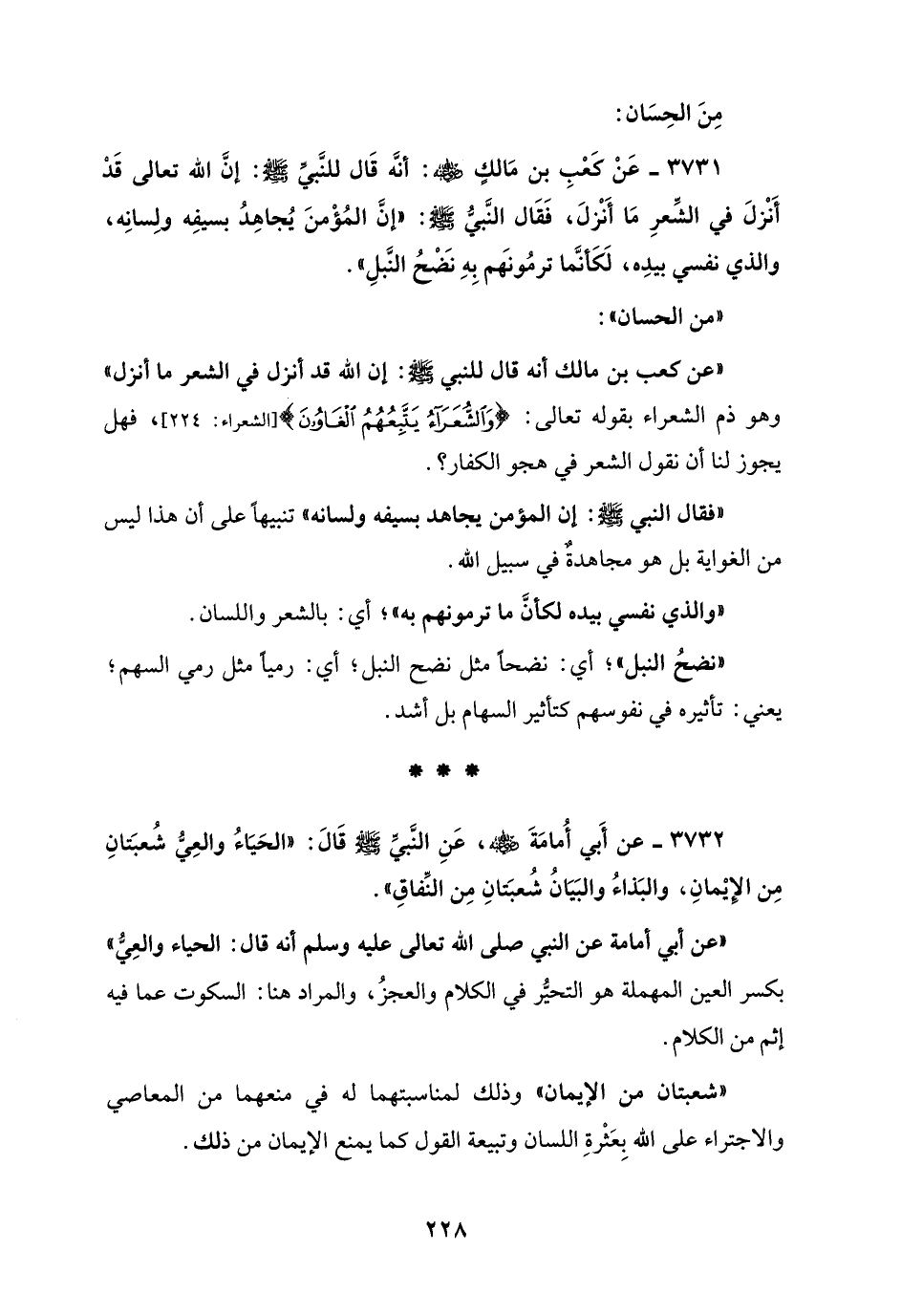 3731 - عَنْ كعبِ بن مَالكٍ - رضي الله عنه -: أنَّه قَال للنَّبيِّ - صلى الله عليه وسلم -: إنَّ الله تعالى قَدْ أَنْزلَ في الشِّعرِ مَا أَنْزلَ، فَقَال النَّبي - صلى الله عليه وسلم -: "إنَّ المُؤْمنَ يُجاهِدُ بسيفِه ولِسانِه، والذي نفسي بيدِه، لَكَأنَّما ترمُونهم بِهِ نضحُ النَّبلِ".