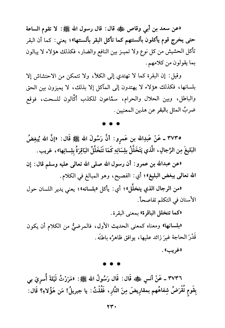 "عن سعد بن أبي وقاص - رضي الله عنه - قال: قال رسول الله - صلى الله عليه وسلم -: لا تقوم الساعة حتى يخرج قوم يأكلون بألسنتهم كما تأكل البقر بألسنتها"؛ يعني: كما أن البقر تأكل الحشيش من كل نوع ولا تميز بين النافع والضار، فكذلك هؤلاء لا يبالون بما يقولون من كلامهم.