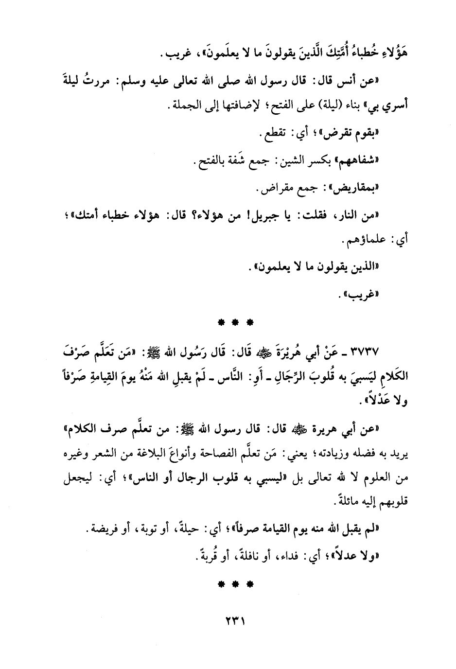 3737 - عَنْ أبي هُريْرَة - رضي الله عنه - قَال: قَال رَسُول الله - صلى الله عليه وسلم -: "مَن تَعَلَّم صَرْفَ الكَلامِ ليَسبيَ به قُلوبَ الرِّجَالِ -أَوِ: النَّاس- لَمْ يقبلِ الله مَنْهُ يومَ القِيامةِ صَرفاً ولا عَدلاً".