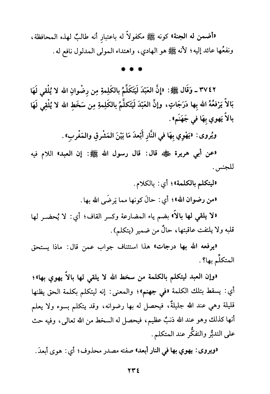 3742 - وَقَال - صلى الله عليه وسلم -: "إنَّ العَبْدَ لَيتكلَّمُ بالكَلِمةِ مِن رِضْوانِ الله لا يُلْقي لَها بَالاً يَرْفعُهُ الله بِها دَرَجَاتٍ، وإنَّ العَبْدَ لَيتكلَّمُ بالكَلِمةِ مِن سَخَطِ الله لا يُلْقِي لَها بالاً يَهوي بِها في جَهنَّم".